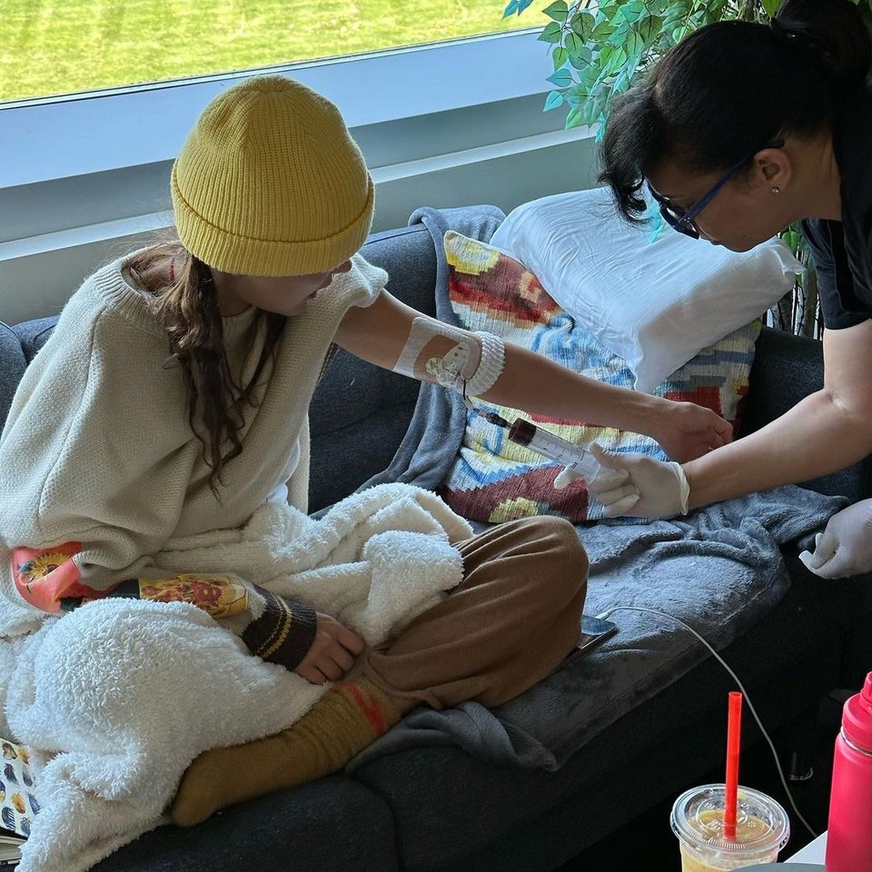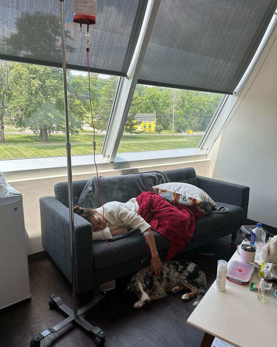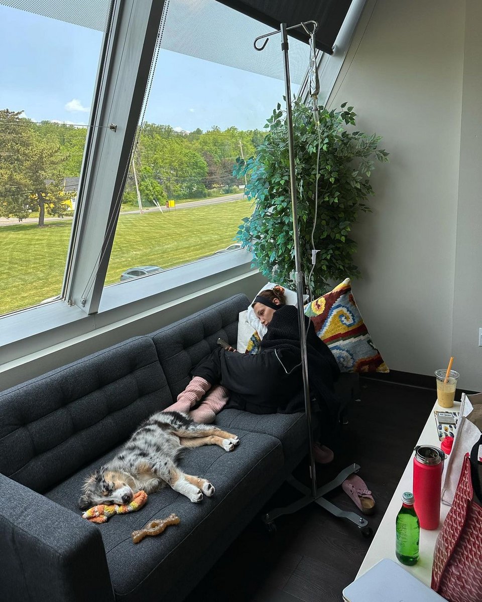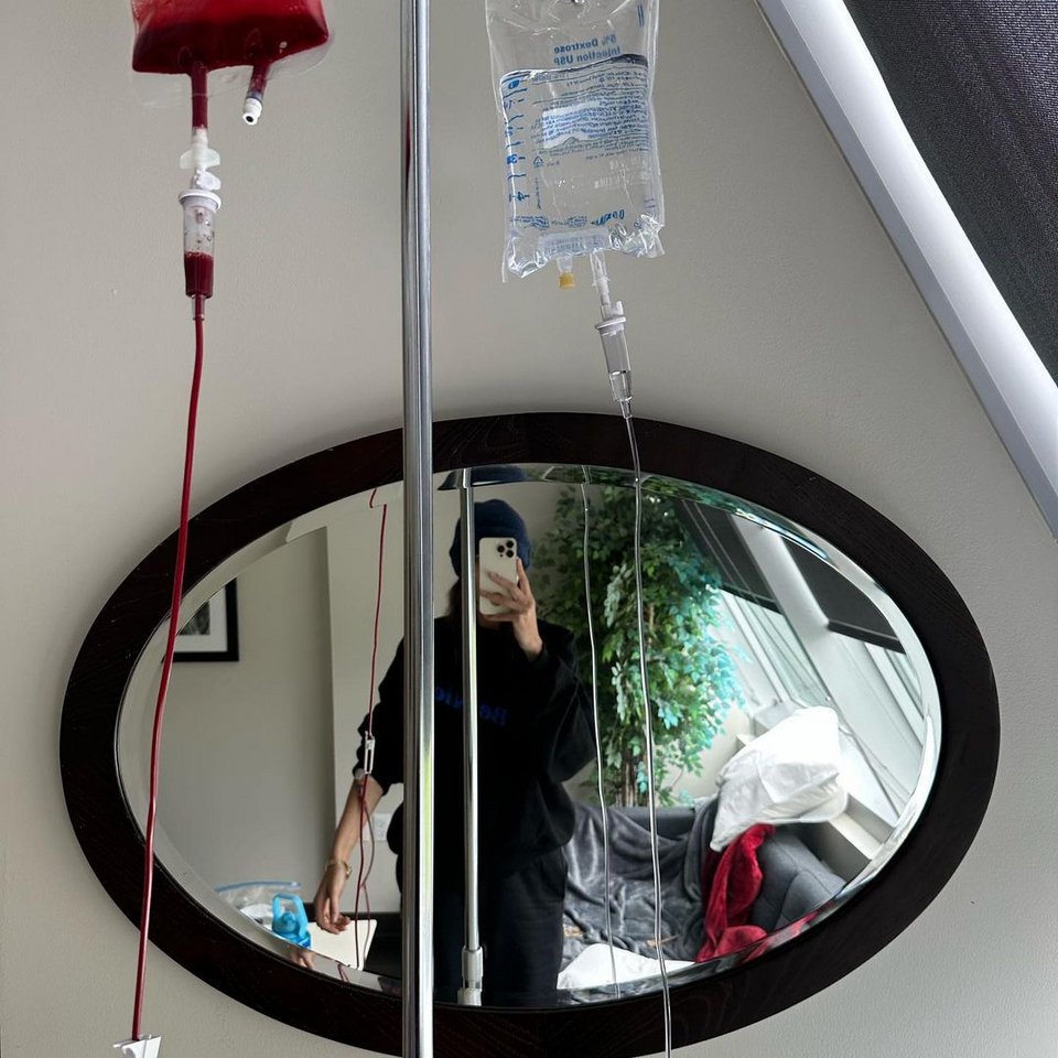 Στις φωτογραφίες η Μπέλα Χαντίντ εμφανίζεται καταβεβλημένη, να ακολουθεί τη θεραπεία για τη νόσο του Lyme, με ορό και επιδέσμους.
