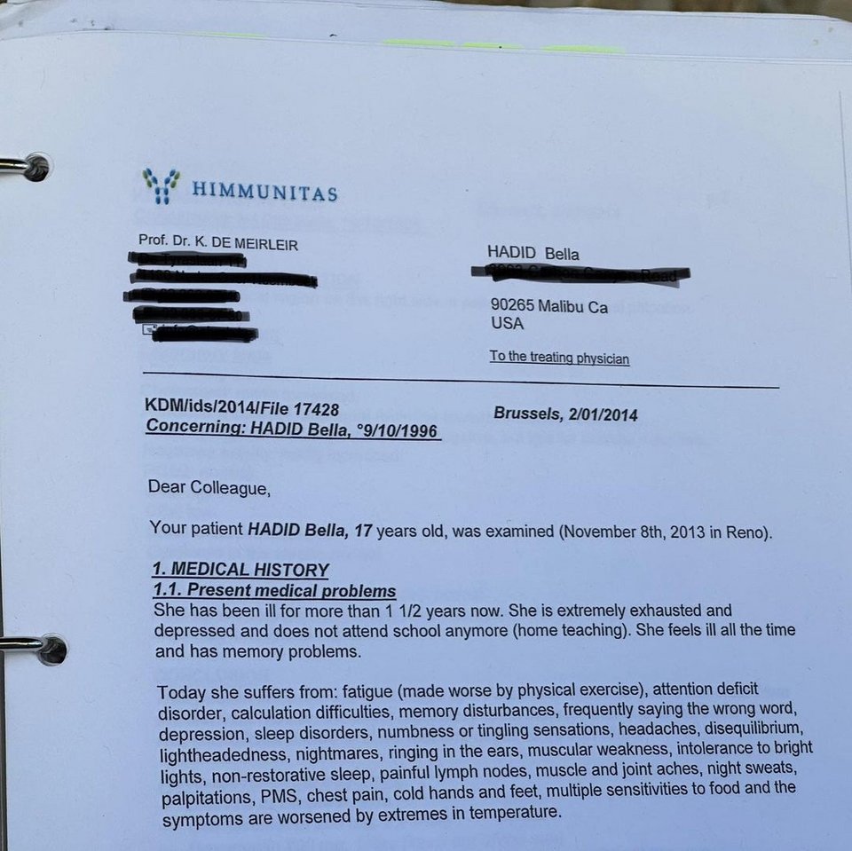 Η Μπέλα Χαντίντ , τρια χρόνια νωρίτερα, είχε προχωρήσει σε μια δημόσια εξομολόγηση αναφορικά με το πώς επηρεάζει την καθημερινότητά της η νόσος του Lyme, με την οποία διαγνώστηκε για πρώτη φορά το 2012. Πρόκειται για μία λοίμωξη στον οργανισμού που μεταδίδεται από τσίμπημα από τσιμπούρι.