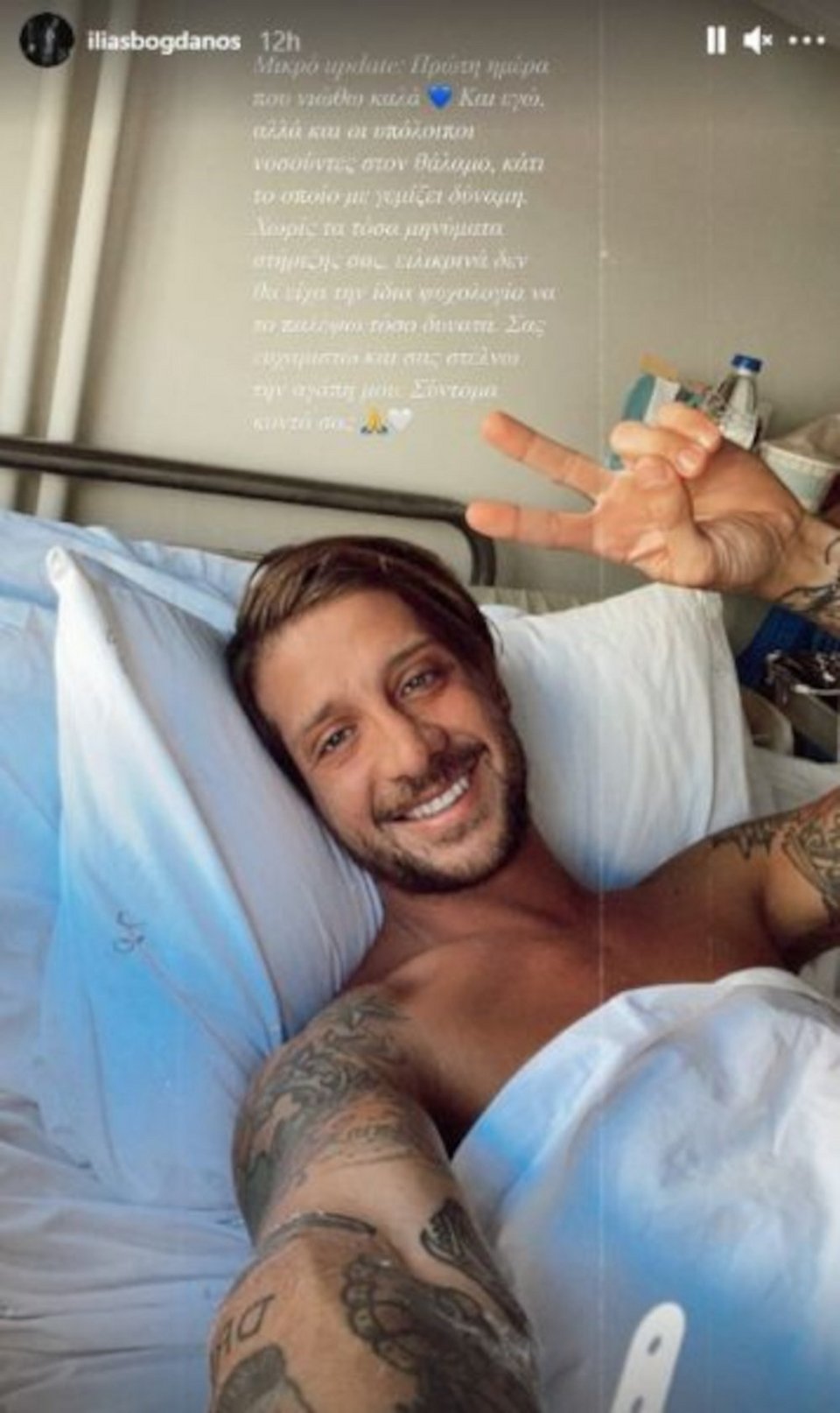 «Mικρό update: Πρώτη μέρα που νιώθω πολύ καλά. Και εγώ αλλά και οι υπόλοιποι νοσούντες στον θάλαμο, κάτι το οποίο με γεμίζει πολύ δύναμη. Χωρίς τα τόσα μηνύματα στήριξής σας δε θα είχα την ψυχολογία να το παλέψω τόσο δυνατά. Σας ευχαριστώ και σας στέλνω την αγάπη μου. Σύντομα κοντά σας», είπε ο Ηλίας Μπόγδανος, που βρέθηκε θετικός λίγες ημέρες μετά τον τελικό του Survivor.