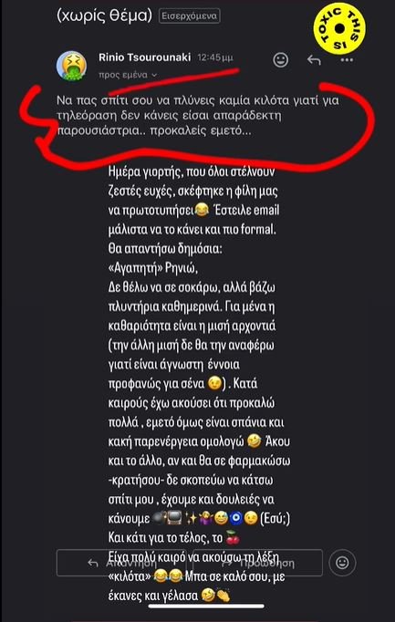 «Ημέρα γιορτής, που όλοι στέλνουν ζεστές ευχές, σκέφτηκε η φίλη μας να πρωτοτυπήσει. Έστειλε email μάλιστα να το κάνει και πιο επίσημο. Θα απαντήσω δημόσια. "Αγαπητή" Ρηνιώ, δεν θέλω να σε σοκάρω, αλλά βάζω πλυντήρια καθημερινά. Για μένα η καθαριότητα είναι η μισή αρχοντιά (την άλλη μισή δε θα την αναφέρω γιατί είναι άγνωστη έννοια προφανώς για σένα). Κατά καιρούς έχω ακούσει ότι προκαλώ πολλά, εμετό όμως είναι σπάνια και κακή παρενέργεια ομολογώ.