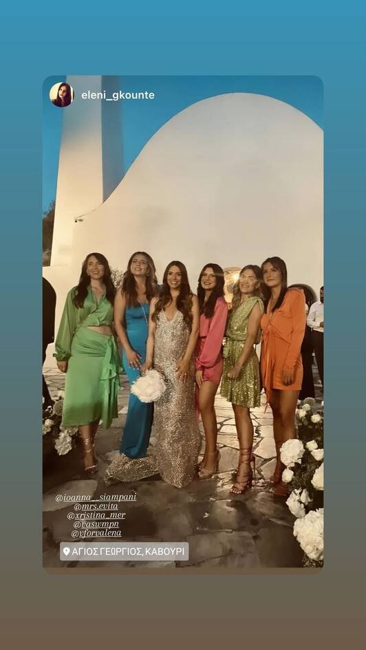 Το νυφικό της Ιωάννας Σιαμπάνη ήταν σε μπεζ αποχρώσεις με αποκαλυπτική πλάτη και είχε την υπογραφή της σχεδιάστριας Maria Konidi.