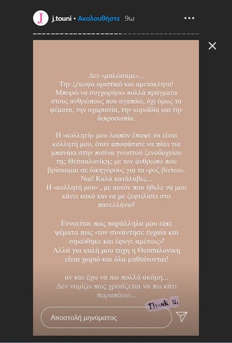 «Δε μαλώσαμε… Την ξέκοψα οριστικά και αμετάκλητα! Μπορώ να συγχωρήσω πολλά πράγματα στους ανθρώπους που αγαπάω, όχι μόνο τα ψέματα, την αχαριστία, κοροϊδία και τη διπροσωπία. Η "κολλητή” μου λοιπόν έπαψε να είναι κολλητή μου, όταν αποφάσισε να πάει για μπανάκι στην πισίνα γνωστού ξενοδοχείου της Θεσσαλονίκης με τον άνθρωπο που βρίσκομαι σε δικηγόρους για το "ροζ βίντεο". Ναι! Καλά κατάλαβες… Η "κολλητή μου”, με αυτόν που ήθελε να μου κάνει κακό και να με ξεφτιλίσει στο πανελλήνιο!», έγραψε η Ιωάννα Τούνη.