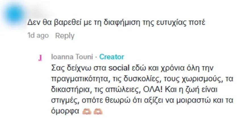 Δείτε το σχόλιο που δέχθηκε η Ιωάννα Τούνη και την απάντησή της
