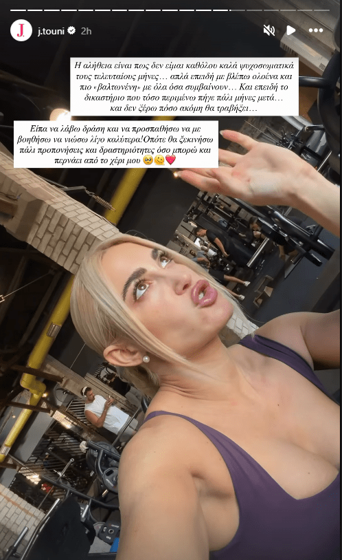 Στο Instagram story της έγραψε: «Η αλήθεια είναι πως δεν είμαι καθόλου καλά ψυχοσωματικά τους τελευταίους μήνες, απλά επειδή με βλέπω ολοένα και πιο βαλτωμένη με όλα όσα συμβαίνουν και επειδή το δικαστήριο που τόσο περίμενα πήγε πάλι μήνες μετά και δεν ξέρω πόσο ακόμα θα τραβήξει, είπα να λάβω δράση και να προσπαθήσω να με βοηθήσω να νιώσω λίγο καλύτερα! Οπότε θα ξεκινήσω πάλι προπονήσεις και δραστηριότητες όσο μπορώ και περνάει από το χέρι μου».