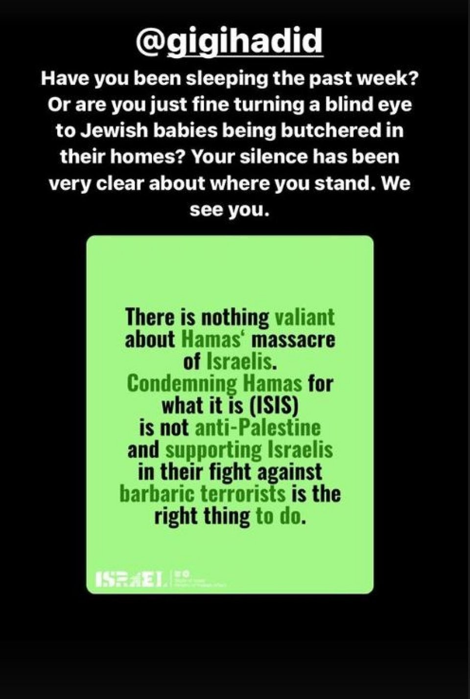 «Kοιμήθηκες την τελευταία εβδομάδα; Ή απλά γυρνάς την πλάτη σου στα μωρά των Εβραίων που σφαγιάζονται στα σπίτια τους; Η σιωπή σου είναι απόλυτα ξεκάθαρη για το ποιον υποστηρίζεις. Σε βλέπουμε», αναφέρεται στο story που ανέβηκε στον επίσημο λογαριασμό της, η κυβέρνηση του Ισραήλ.
