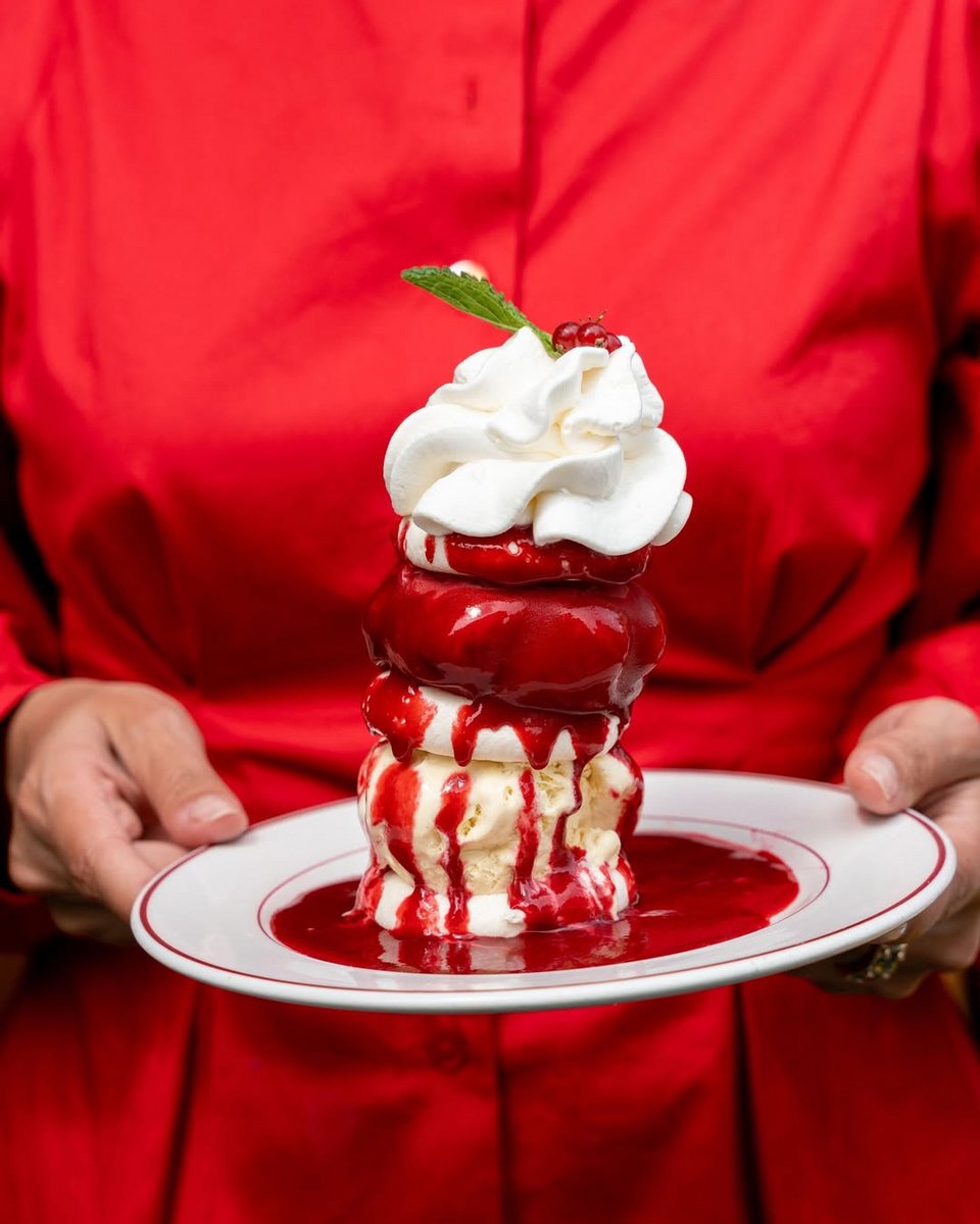 Το γεύμα ολοκληρώνεται με μια επιλογή παραδοσιακών γαλλικών επιδορπίων, από crème brûlée έως μια φέτα σοκολατένιου gâteau, και συνοδεύεται ιδανικά από ένα ποτήρι κρασί Château de Saurs, από το οικογενειακό κτήμα στην Οξιτανία.