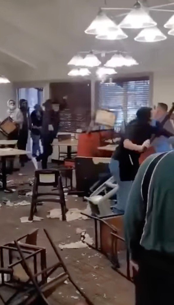 Καρέκλες, αναποδογυρισμένα τραπέζια και σκισμένες χαρτοπετσέτες φαίνονται διάσπαρτα στο πάτωμα του εστιατορίου. Παρά τις προσπάθειες των υπαλλήλων, οι πελάτες συνεχίζουν να ουρλιάζουν. «Το μόνο που ήθελα ήταν μία μπριζόλα» ακούγεται να λέει ένας άντρας στο βάθος.