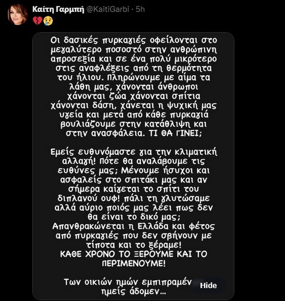 Πότε θα αναλάβουμε τις ευθύνες μας; Μένουμε ήσυχοι και ασφαλείς στο σπιτάκι μας και αν σήμερα καίγεται το σπίτι του διπλανού ουφ, πάλι τη γλυτώσαμε αλλά αύριο ποιός μας λέει πως δεν θα είναι το δικό μας; Απανθρακώνεται η Ελλάδα και φέτος από πυρκαγιές που δεν σβήνουν με τίποτα και το ξέραμε! Κάθε χρόνο το ξέρουμε και το περιμένουμε. Των οικιών ημών εμπιπραμένων ημείς άδομεν…», έγραψε στην πρώτη της ανάρτηση η Καίτη Γαρμπή.
