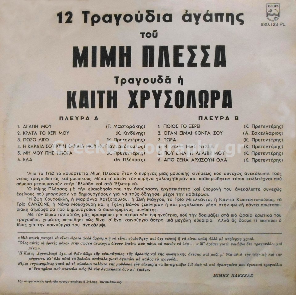 Ο δίσκος «Αγάπη μου» που κυκλοφόρησε από την Phillips το 1966 πέρα από πάρα πολύ σπάνιος είναι και μοναδικός, καθώς είναι από τα ελάχιστα αμιγώς τζαζ, ελαφρά άλμπουμ στη χώρα μας. Αποτελείται από δώδεκα υπέροχα κομμάτια σε μουσική του Μίμη Πλέσσα με την υπέροχη φωνή της Καίτης Χρυσολωρά.