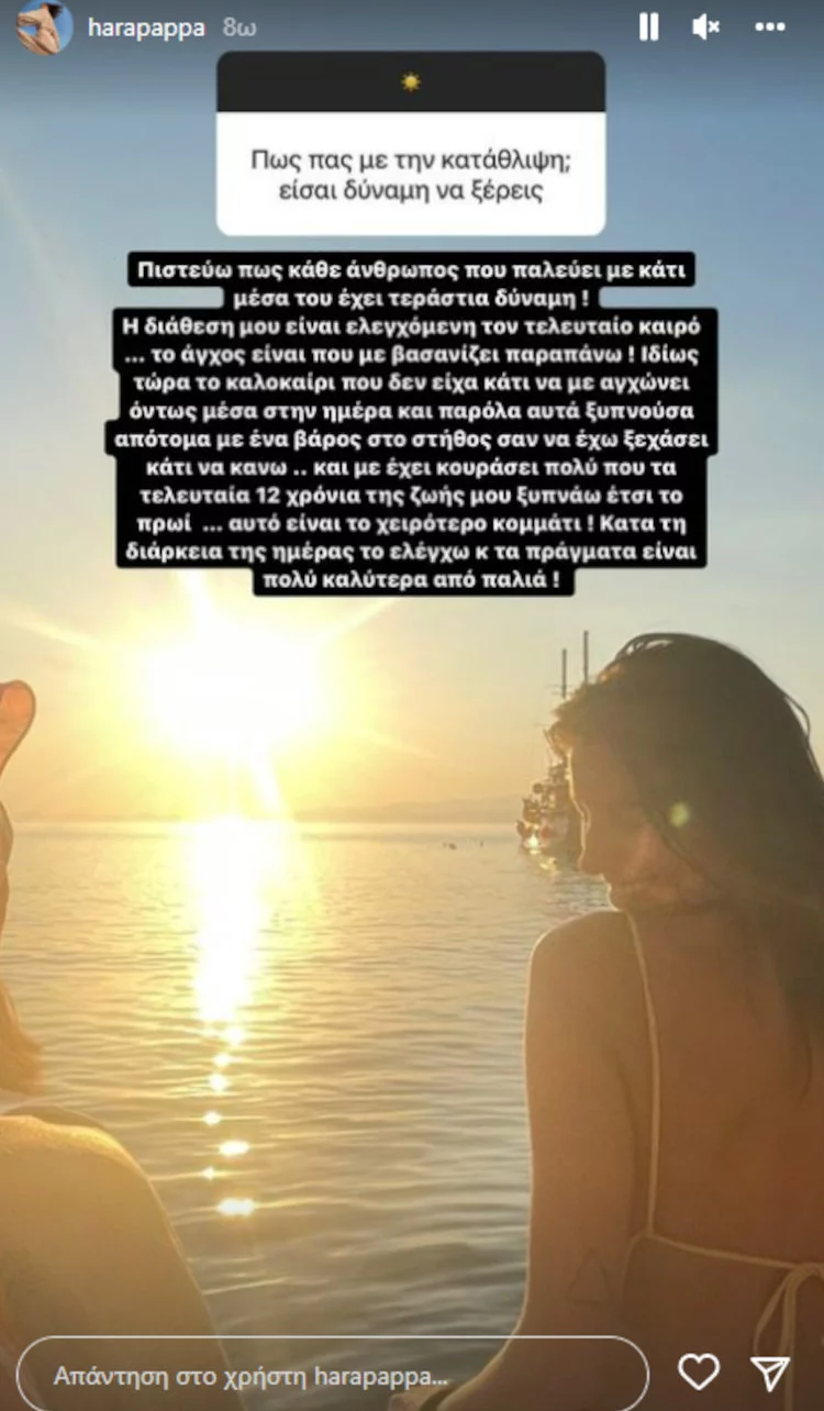 «Πιστεύω πως κάθε άνθρωπος που παλεύει με κάτι, μέσα του έχει τεράστια δύναμη. Η διάθεσή μου είναι ελεγχόμενη τον τελευταίο καιρό. Το άγχος είναι κάτι που με βασανίζει παραπάνω. Ιδίως τώρα το καλοκαίρι, που δεν είχα κάτι να με αγχώνει όντως μέσα στην ημέρα. Παρ' όλα αυτά, ξυπνούσα απότομα με ένα βάρος στο στήθος, σαν να έχω ξεχάσει κάτι να κάνω. Και με έχει κουράσει πολύ που τα τελευταία 12 χρόνια της ζωής μου ξυπνώ έτσι το πρωί. Αυτό είναι το χειρότερο κομμάτι», έγραψε σε story της στο Instagram η Χαρά Παππά.