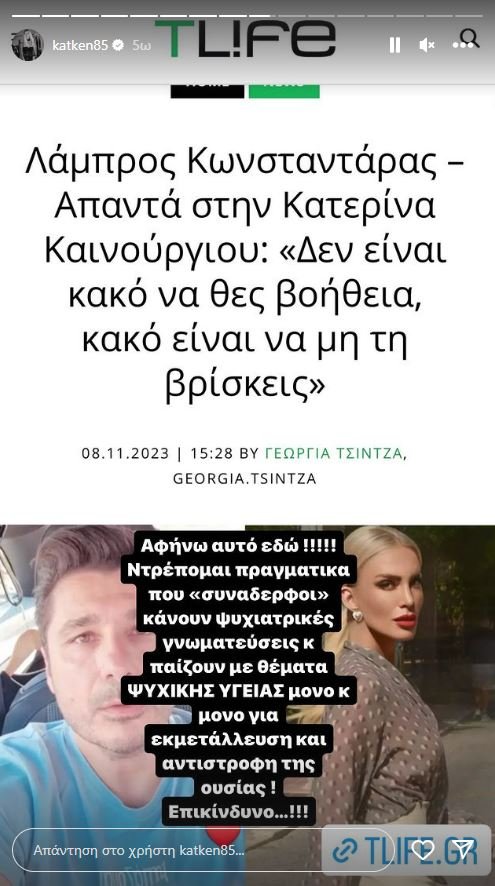«Αφήνω αυτό εδώ. Ντρέπομαι πραγματικά που "συνάδελφοι" κάνουν ψυχιατρικές γνωματεύσεις και παίζουν με θέματα ΨΥΧΙΚΗΣ ΥΓΕΙΑΣ μόνο και μόνο για εκμετάλλευση και αντιστροφή της ουσίας. Επικίνδυνο» είπε η Κατερίνα Καινούργιου, εμφανώς ενοχλημένη από τα λεγόμενα του Λάμπρου Κωνσταντάρα.