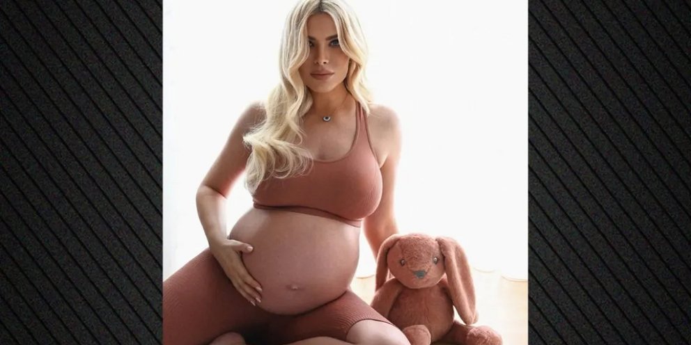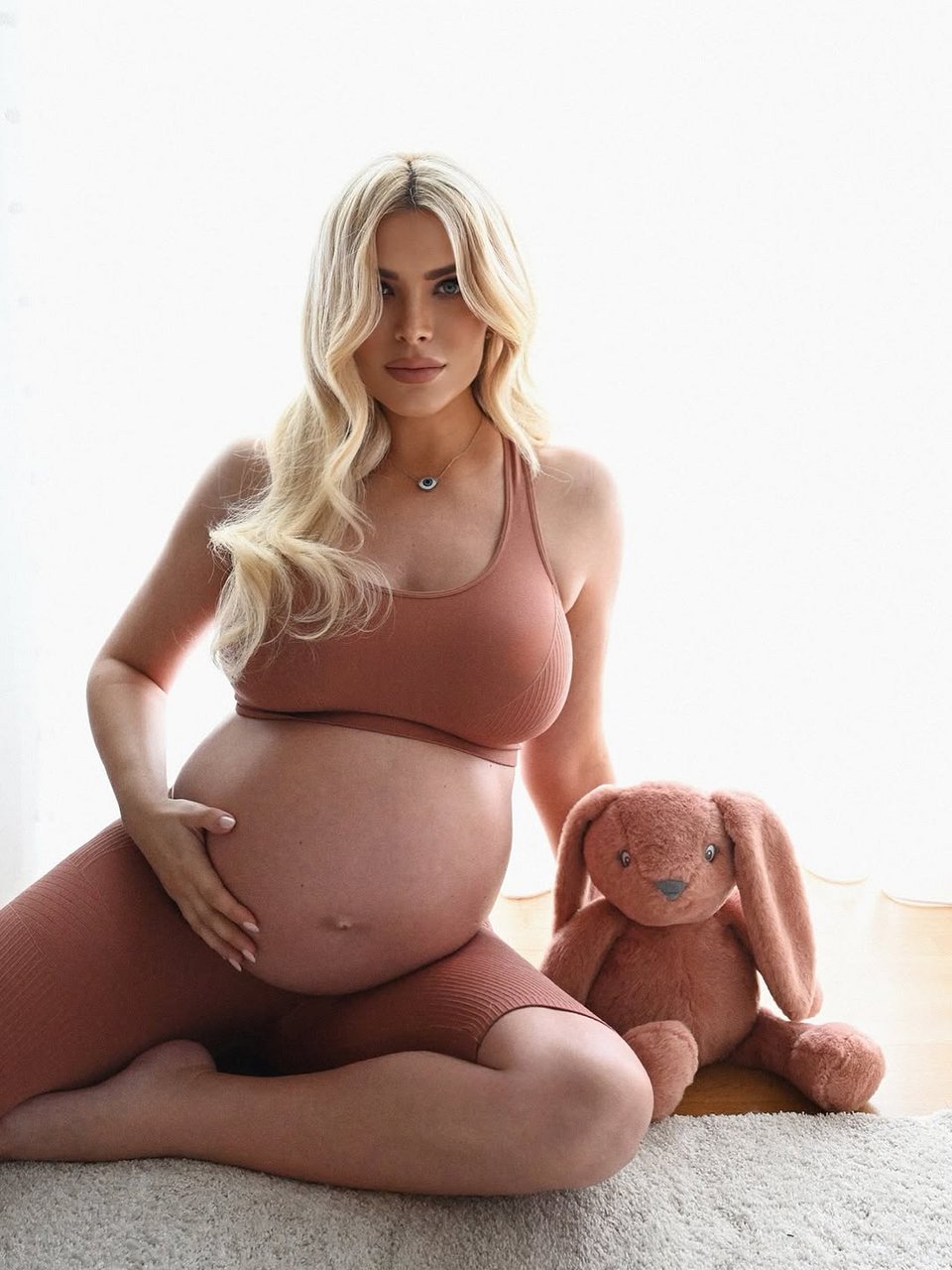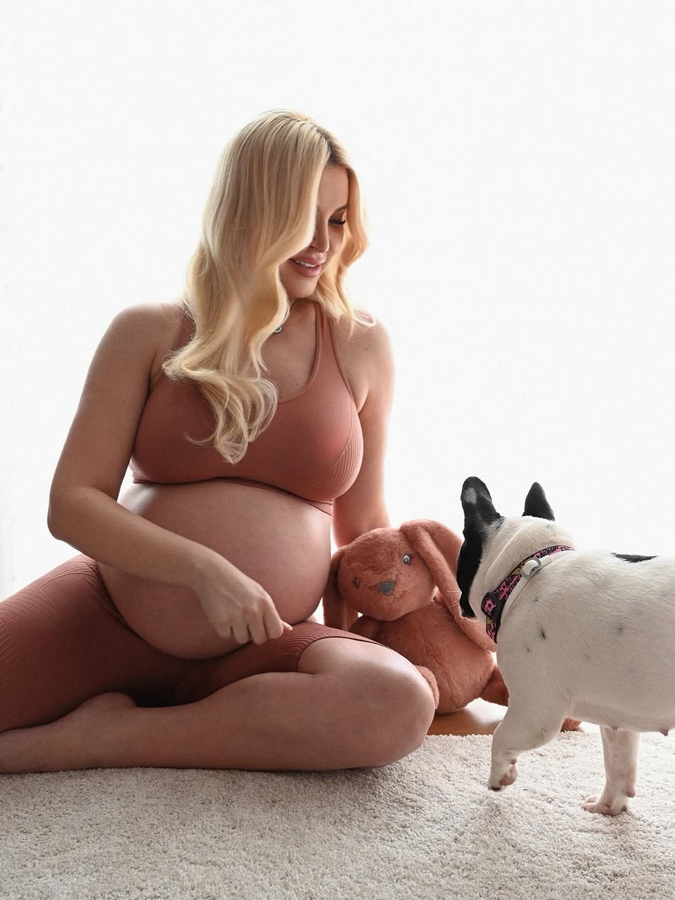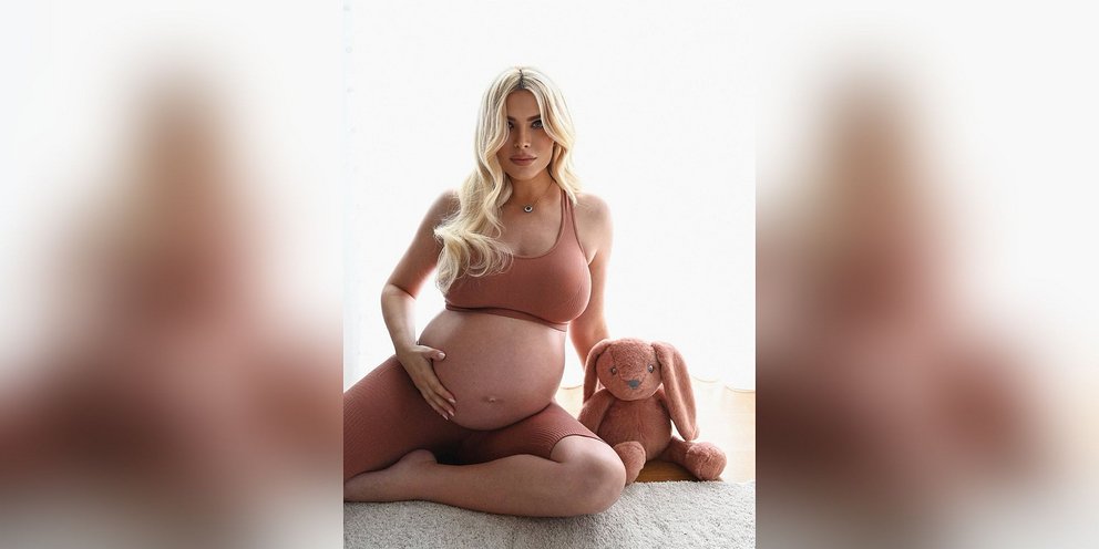 Η παρουσιάστρια δημοσίευσε στο Instagram φωτογραφίες που αναδεικνύουν τη φουσκωμένη της κοιλιά, φορώντας αθλητικό σουτιέν και ασορτί βερμούδα, ενώ καθόταν χαλαρά στο πάτωμα και ακουμπούσε τρυφερά το μωρό της.