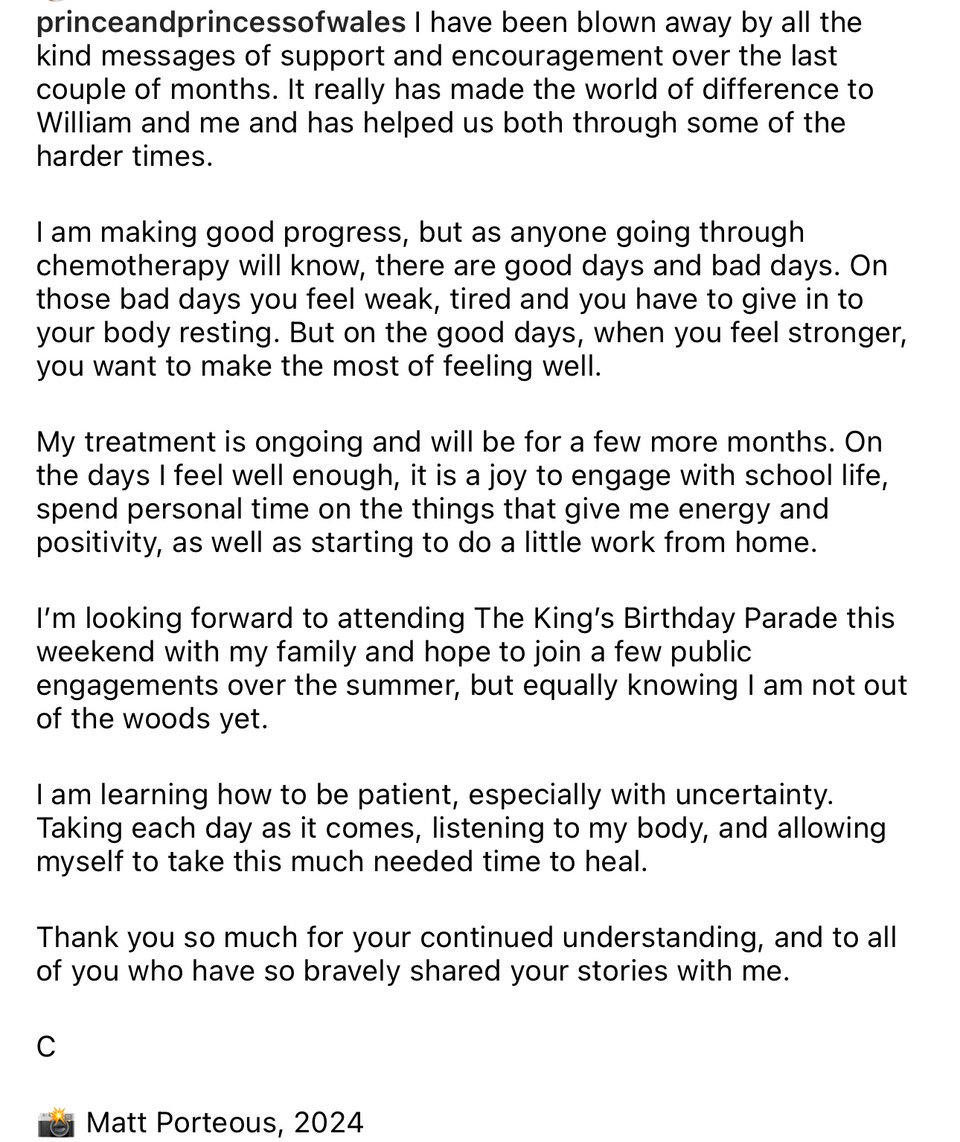 Η Κέιτ, αν και ακόμα δεν έχει αναρρώσει πλήρως, έχει «καλές και κακές ημέρες» και δεν έχει διαφύγει ακόμα τον κίνδυνο, πρόκειται να παραστεί στο «Trooping the Color».