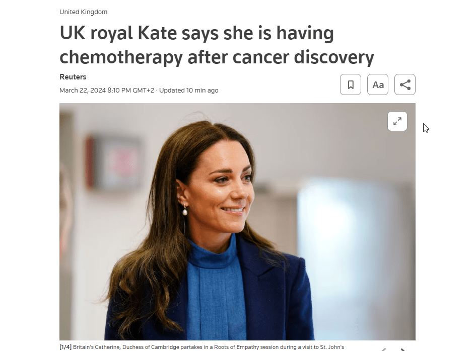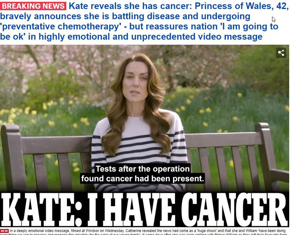 Η Daily Mail γράφει στον τίτλο: Η Κέιτ αποκάλυψε πως έχει καρκίνο. Η 42χρονη πριγκίπισσα της Ουαλίας, γενναία αν ανακοίνωσε πως δίνει μάχη με την ασθένεια και κάνει χημειοθεραπείες», προσθέτοντας την φράση της: «θα είμαι καλά»