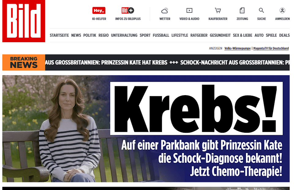 «Καρκίνος! Η Κέιτ ανακοινώνει τη συγκλονιστική διάγνωση σε ένα παγκάκι στο πάρκο. Ξεκινά χημειοθεραπείες» περιγράφει η Γερμανική Bild.