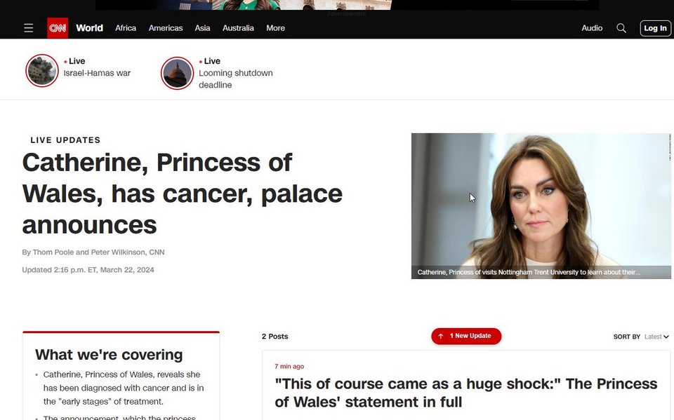 «Η Κάθριν, πριγκίπισσα της Ουαλίας, έχει καρκίνο» αναφέρει στον τίτλο του το CNN, το οποίο το ανέδειξε σε πρώτο θέμα.