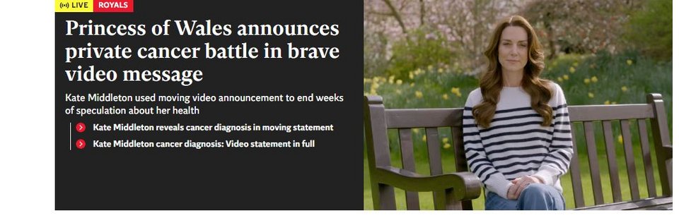 «Η πριγκίπισσα της Ουαλίας λέει ότι κάνει θεραπεία για τον καρκίνο» σχολιάζει το BBC, το οποίο έχει και live ενημέρωση για τις εξελίξεις.