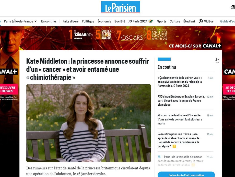 Στη Γαλλία, η Le Parisien φιλοξενεί επίσης την είδηση στο πρώτο της θέμα: «Κέιτ Μίντλετον: Η πριγκίπισσα ανακοινώνει ότι πάσχει από «καρκίνο» και ξεκίνησε χημειοθεραπείες» αναφέρει.