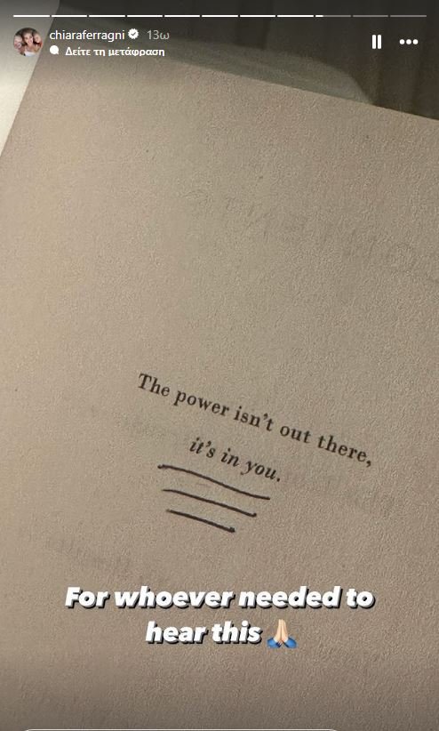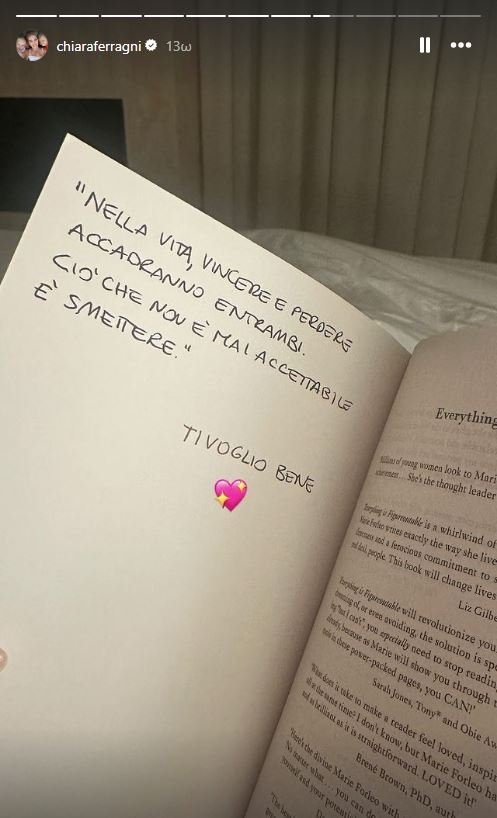 Η Κιάρα Φεράνι, από την πλευρά της, έχει αναρτήσει τις τελευταίες ώρες δύο ιστορίες που υπό το φως της είδησης φαίνεται να υποδηλώνουν αλλαγή. Συγκεκριμένα, μοιράστηκε τη φωτογραφία ενός βιβλίου με την εξής αφιέρωση: «Στη ζωή, και η νίκη και η ήττα θα συμβούν. Αυτό που δεν είναι ποτέ αποδεκτό είναι να παραιτηθείς».