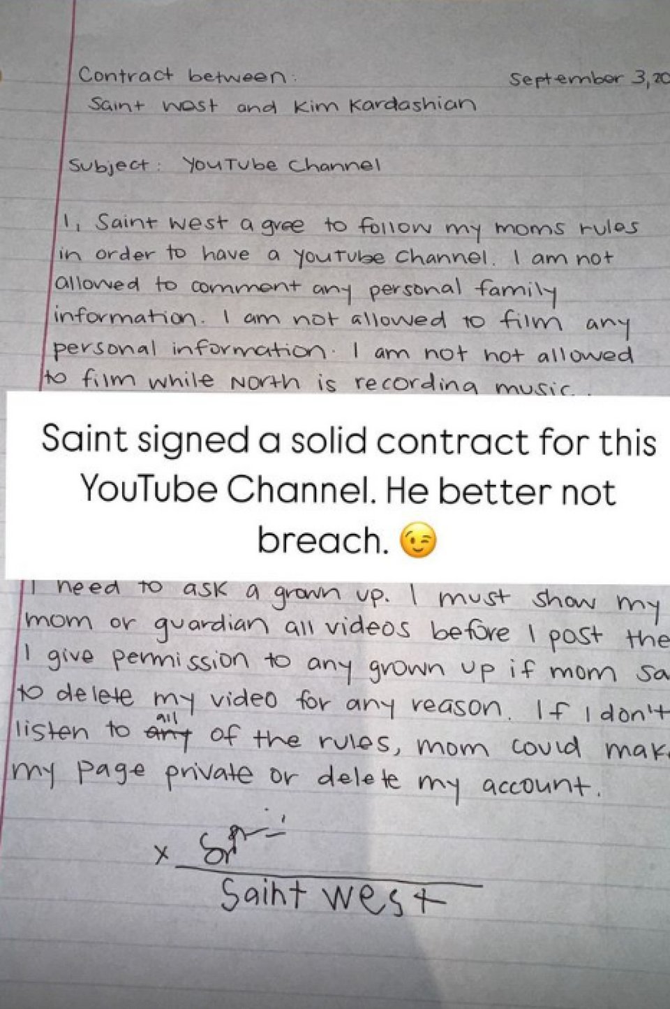 Η Κιμ Καρντάσιαν γράφει μεταξύ άλλων: «Εγώ, ο Σεντ Γουέστ, συμφωνώ να ακολουθήσω τους κανόνες της μητέρας μου προκειμένου να έχω κανάλι στο YouTube. Δεν μου επιτρέπεται να σχολιάζω [οποιαδήποτε] προσωπική οικογενειακή πληροφορία. Δεν επιτρέπεται να βιντεοσκοπώ προσωπικές πληροφορίες. Δεν επιτρέπεται να βιντεοσκοπώ ενώ η αδερφή μου, Νορθ, ηχογραφεί μουσική. Πρέπει να δείχνω στη μαμά μου ή στον κηδεμόνα μου όλα τα βίντεο πριν τα δημοσιεύσω. Δίνω την άδεια σε οποιονδήποτε ενήλικα αν η μαμά πει να διαγράψει το βίντεο μου για οποιονδήποτε λόγο. Αν δεν ακούσω όλους τους κανόνες, η μαμά μου μπορεί να κάνει τη σελίδα μου ιδιωτική ή να διαγράψει τον λογαριασμό μου».