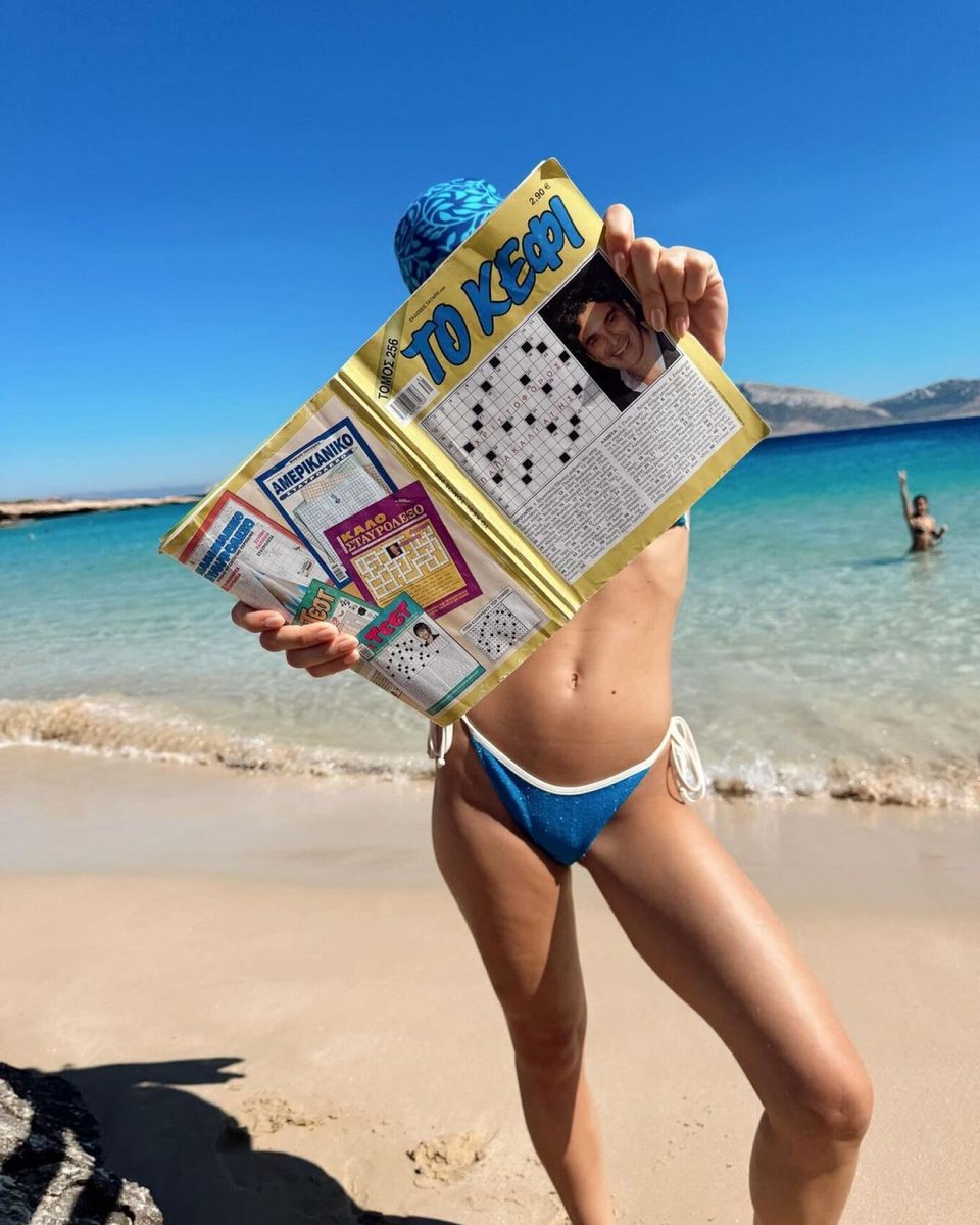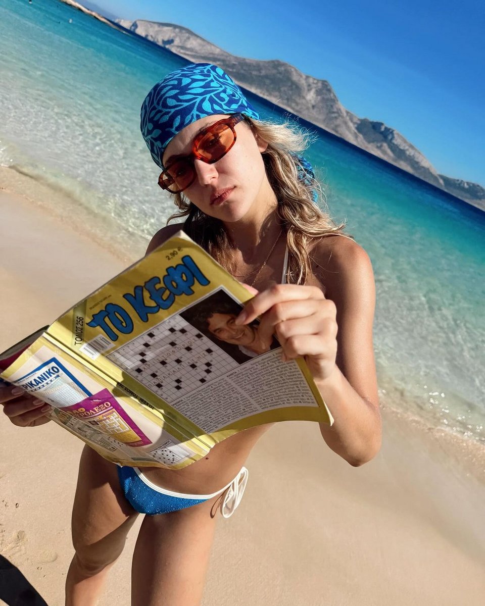 Στις φωτογραφίες, κρατάει ένα σταυρόλεξο, που έχει στο εξώφυλλό του τον Χριστόφορο Παπακαλιάτη και ποζάρει με μπλε μπικίνι μπροστά στη θάλασσα.