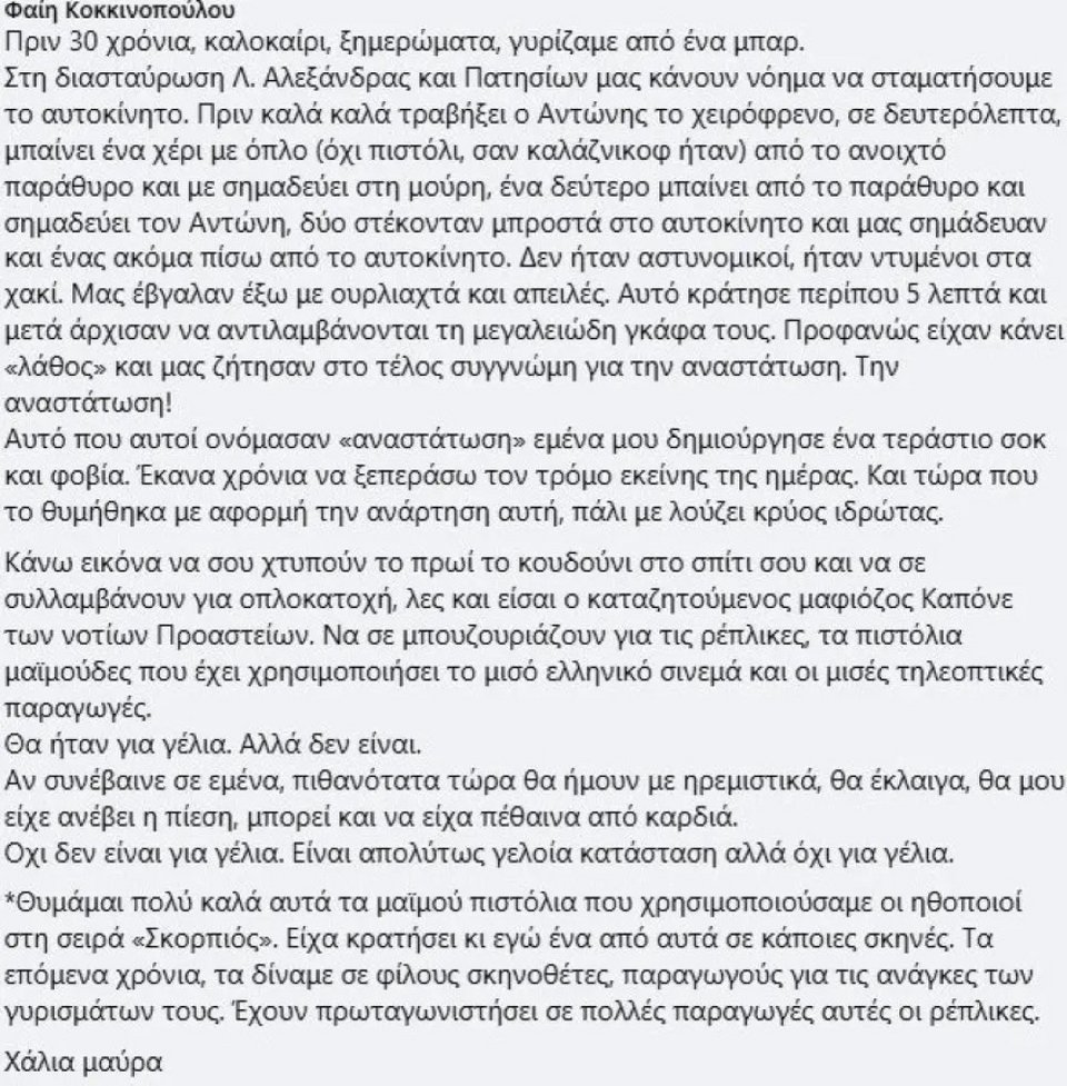 «Πριν 30 χρόνια, καλοκαίρι, ξημερώματα, γυρίζαμε από ένα μπαρ. Στη διασταύρωση Λ. Αλεξάνδρας και Πατησίων μας κάνουν νόημα να σταματήσουμε το αυτοκίνητο. Πριν καλά καλά τραβήξει ο Αντώνης το χειρόφρενο, σε δευτερόλεπτα, μπαίνει ένα χέρι με όπλο (όχι πιστόλι, σαν καλάσνικοφ ήταν) από το ανοιχτό παράθυρο και με σημαδεύει στη μούρη, ένα δεύτερο μπαίνει από το παράθυρο και σημαδεύει τον Αντώνη, δύο στέκονταν μπροστά στο αυτοκίνητο και μας σημάδευαν και ένας ακόμα πίσω από το αυτοκίνητο. Δεν ήταν αστυνομικοί, ήταν ντυμένοι στα χακί. Μας έβγαλαν έξω με ουρλιαχτά και απειλές. Αυτό κράτησε περίπου 5 λεπτά και μετά άρχισαν να αντιλαμβάνονται τη μεγαλειώδη γκάφα τους. Προφανώς είχαν κάνει ''λάθος'' και μας ζήτησαν στο τέλος συγγνώμη για την αναστάτωση. Την αναστάτωση. Αυτό που αυτοί ονόμασαν ''αναστάτωση'' εμένα μου δημιούργησε ένα τεράστιο σοκ και φοβία. Έκανα χρόνια να ξεπεράσω τον τρόμο εκείνης της ημέρας. Και τώρα που το θυμήθηκα με αφορμή την ανάρτηση αυτή, πάλι με λούζει κρύος ιδρώτας. Κάνω εικόνα να σου χτυπούν το πρωί το κουδούνι στο σπίτι σου και να σε συλλαμβάνουν για οπλοκατοχή, λες και είσαι ο καταζητούμενος μαφιόζος Καπόνε των νοτίων Προαστίων. Να σε μπουζουριάζουν για τις ρέπλικες, τα πιστόλια μαϊμούδες που έχει χρησιμοποιήσει το μισό ελληνικό σινεμά και οι μισές τηλεοπτικές παραγωγές. Θα ήταν για γέλια. Αλλά δεν είναι.
