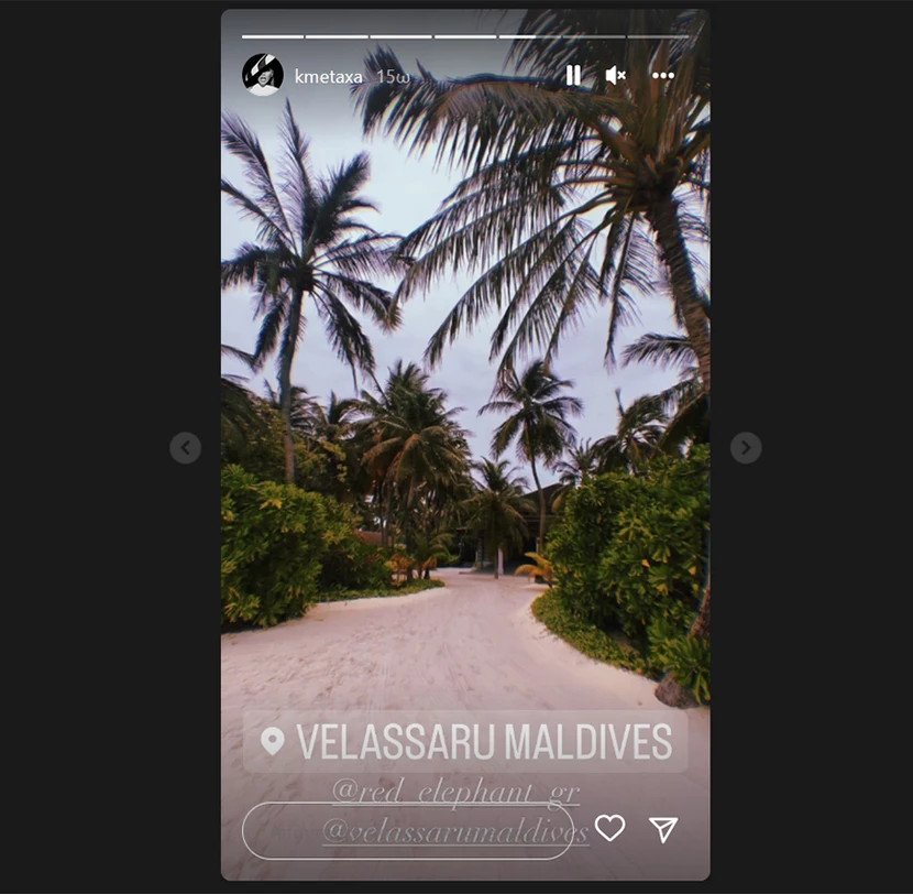 Το ζευγάρι ταξίδεψε μέσω Κωνσταντινούπολης στις Μαλδίβες και η Κόνι Μεταξά ήδη ανέβασε φωτογραφίες και βίντεο από το ταξίδι τους και τη διαμονή τους στο εξωτικό αυτό μέρος.
