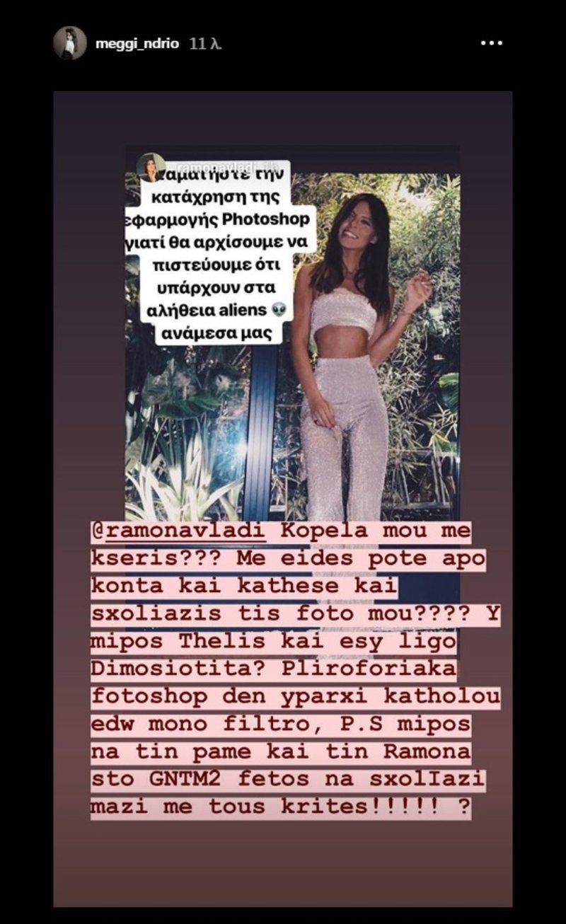 Η νικήτρια του My Style Rocks 1, που έχει δείξει να μην μασά τα λόγια της και διαφωνούσε συνεχώς με τους κριτές, ανέβασε σε story της φωτογραφία της Μέγκι Ντρίο, υπονοώντας πως κάνει photoshop. «Σταματήστε την κατάχρηση της εφαρμογής Photoshop γιατί θα αρχίσουμε να πιστεύουμε ότι υπάρχουν στα αλήθεια aliens ανάμεσα μας», έγραψε η Ραμόνα Βλαντή.