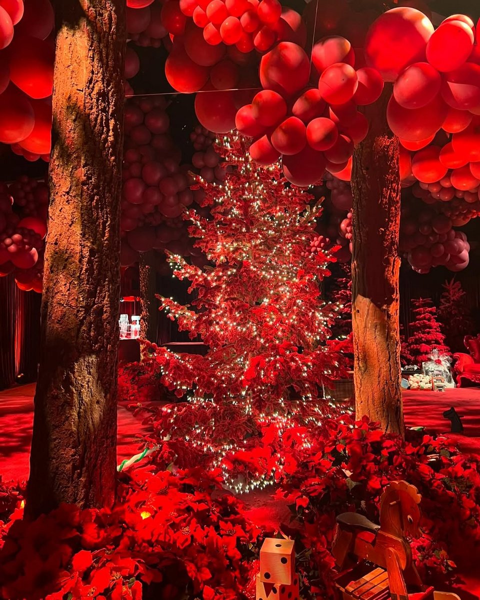 Η Κόρτνεϊ ποζάρει με μίνι φόρεμα και ψηλές κόκκινες μπότες μπροστά από το χριστουγεννιάτικο δέντρο.