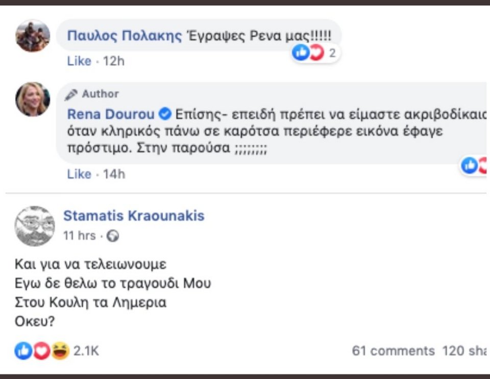 Με δύο αναρτήσεις στο facebook ο Σταμάτης Κραουνάκης λέει ότι δεν φανταζόταν ποτέ, όταν έγραφε το τραγούδι «Τα πιο ωραία λαϊκά» ότι θα το τραγουδούσαν έξω από το Μέγαρο Μαξίμου «με δεξιά κυβέρνηση» και με απαξιωτικούς χαρακτηρισμούς προς τον Πρωθυπουργό και τον Δήμαρχο Αθηναίων ζητά «να πληρώσουν με το επίδομα όσου έχουν αφήσει απ΄έξω».