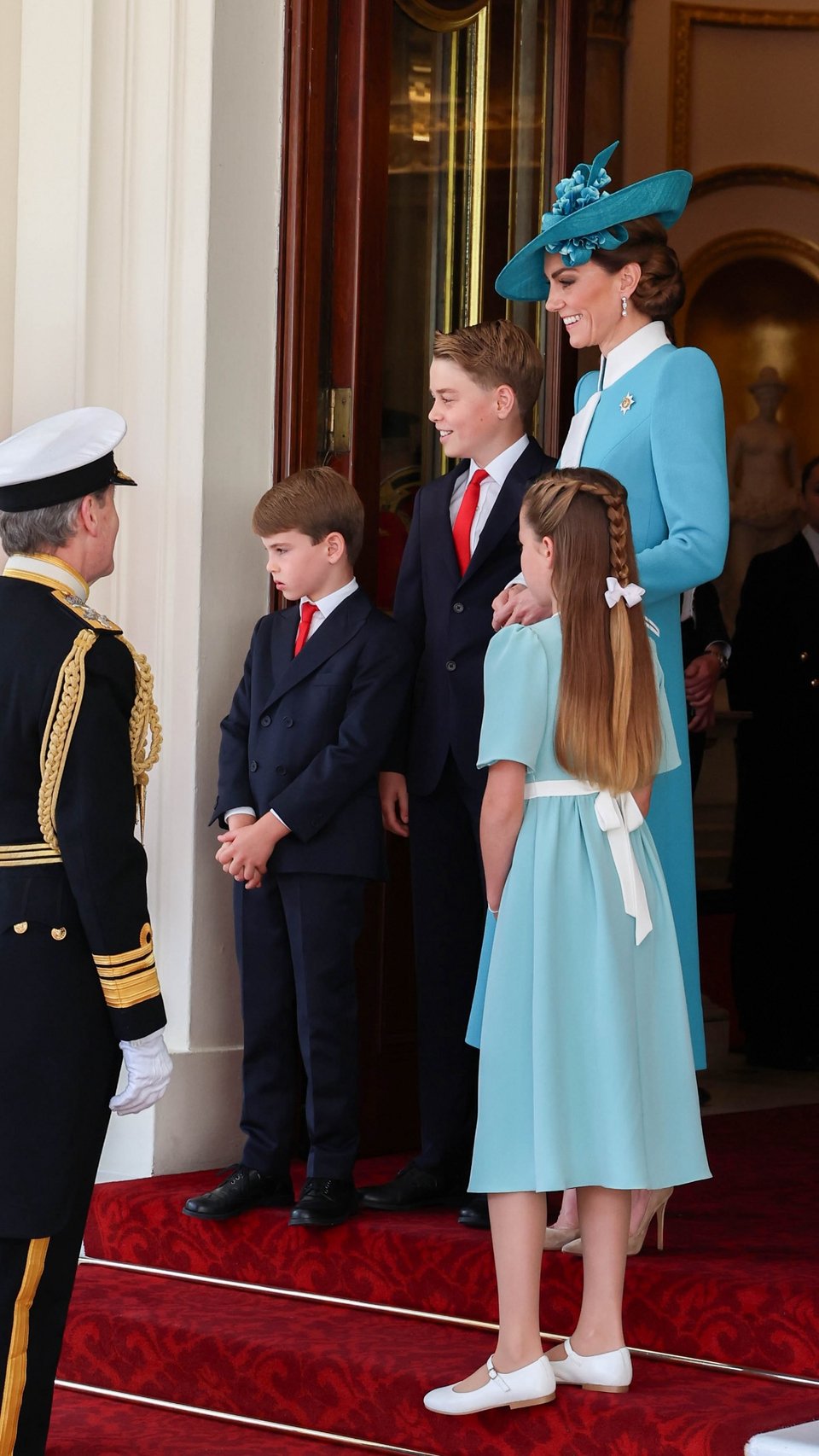 Ενώ ο Πρίγκιπας Γουίλιαμ ίππευε και ήταν σχεδόν αγνώριστος, η Κέιτ καθόταν στην άμαξα με τα τρία τους παιδιά, χαμογελώντας πλατιά και μοιραζόμενη μια γλυκιά στιγμή με την Σάρλοτ. Ο Τζορτζ και ο Λούις φορούσαν ασορτί κοστούμια με γραβάτες και κάθονταν απέναντι.