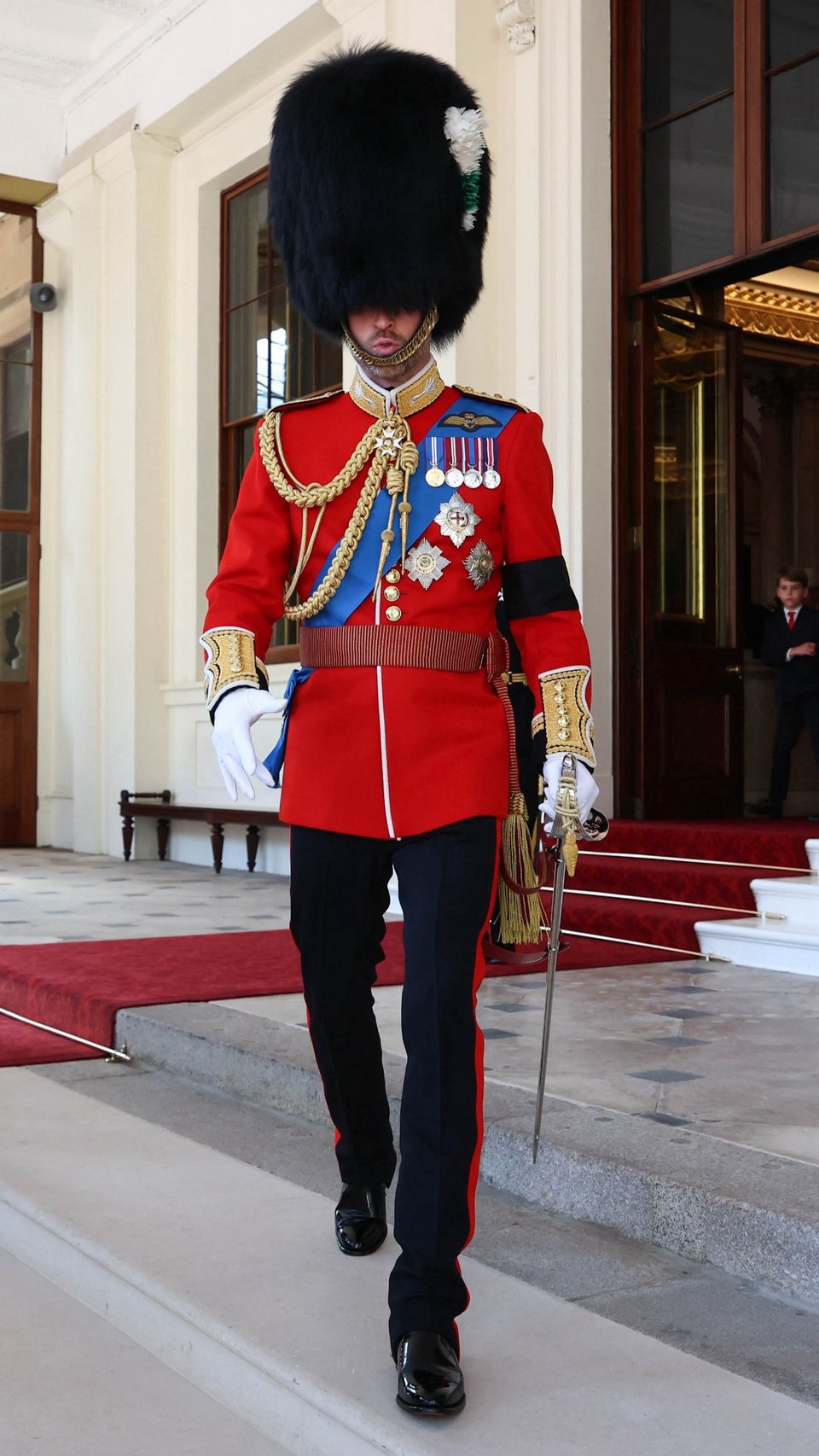 Έφιπποι και φορώντας περιβραχιόνια ήταν ο πρίγκιπας της Ουαλίας, Συνταγματάρχης της Ουαλικής Φρουράς, η πριγκίπισσα Άννα, Συνταγματάρχης των Blues and Royals, και ο Δούκας του Εδιμβούργου, Συνταγματάρχης των Scots Guards.