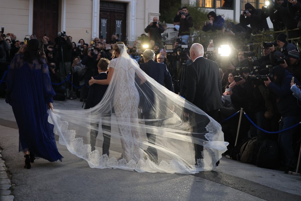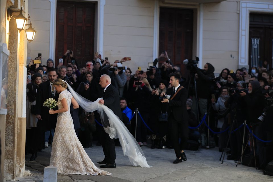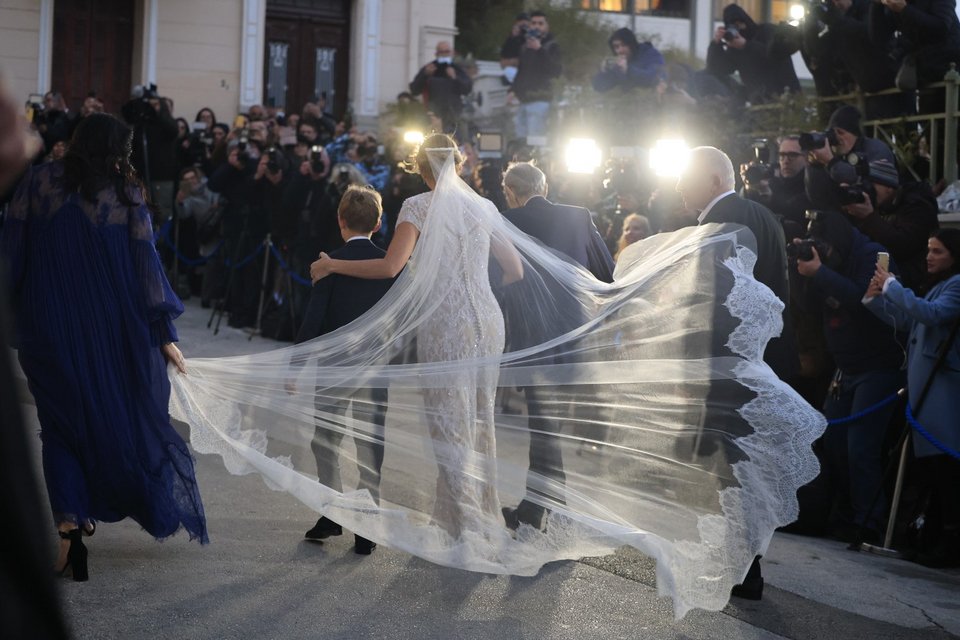 Συγκεκριμένα, η νύφη φόρεσε ένα ειδικά σχεδιασμένο νυφικό από τον γνωστό Έλληνα σχεδιαστή Χρήστο Κωσταρέλλο.
