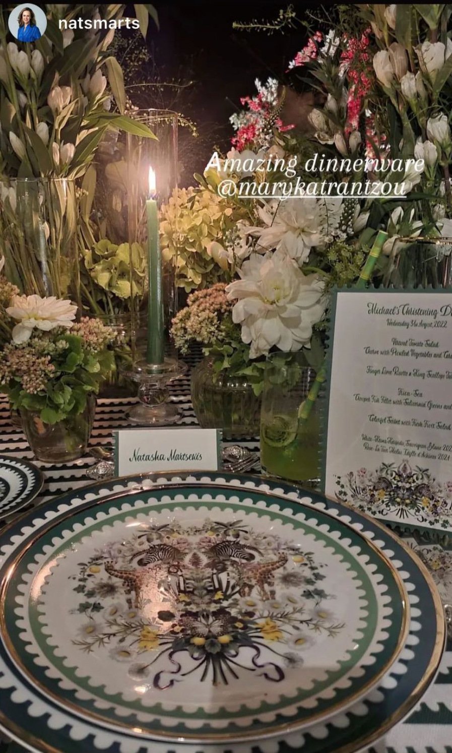 Μετά τη βάπτιση ακολούθησε glam party σε έναν παραμυθένιο χώρο, όπου είχε δημιουργηθεί ένα σκηνικό με τέσσερα τραπέζια σε διαφορετικά χρώματα, εντυπωσιακό art de la table και show με βεγγαλικά.