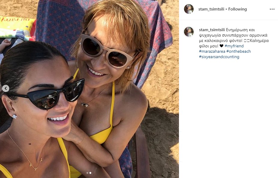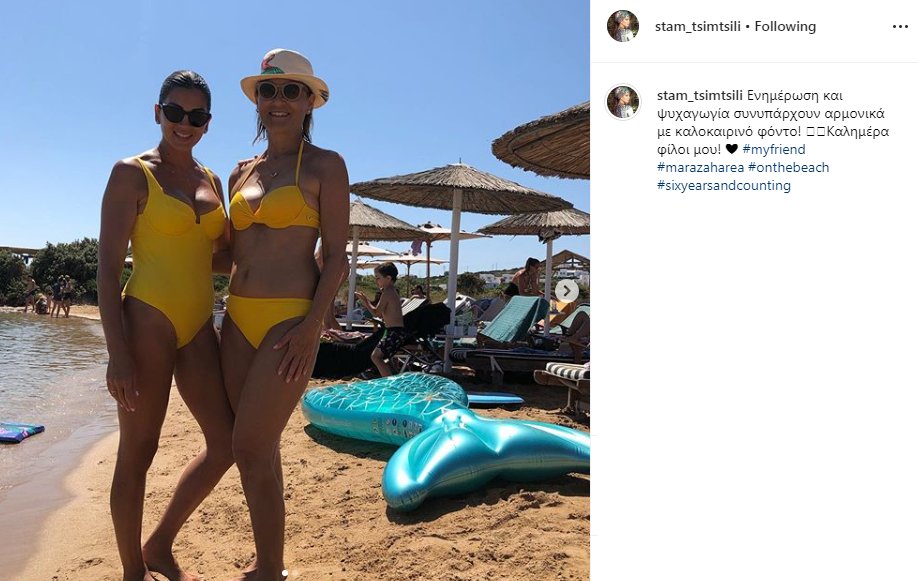 Το πρωί της Τετάρτης οι δυο κυρίες πόζαραν χαμογελαστές με... ασορτί κίτρινο μαγιό στην αμμουδιά. «Ενημέρωση και ψυχαγωγία συνυπάρχουν αρμονικά με καλοκαιρινό φόντο! Καλημέρα φίλοι μου», έγραψε χαρακτηριστικά η Σταματίνα Τσιμτσιλή, δίπλα από τις φωτογραφίες που δημοσίευσε στον προσωπικό της λογαριασμό στο Instagram.