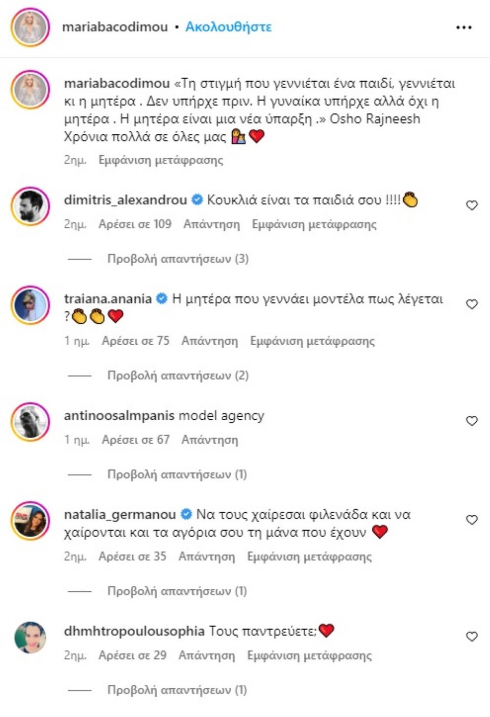 «”Τη στιγμή που γεννιέται ένα παιδί, γεννιέται κι η μητέρα . Δεν υπήρχε πριν. Η γυναίκα υπήρχε αλλά όχι η μητέρα . Η μητέρα είναι μια νέα ύπαρξη”. Osho Rajneesh. Χρόνια πολλά σε όλες μας», έγραψε η Μαρία Μπακοδήμου στη λεζάντα της δημοσίευσής της, με την ίδια να εικονίζεται ανάμεσα στους δύο γιους της, τον Νικήτα και τον Άρη Αργυρόπουλο, να ποζάρει χαμογελαστή.