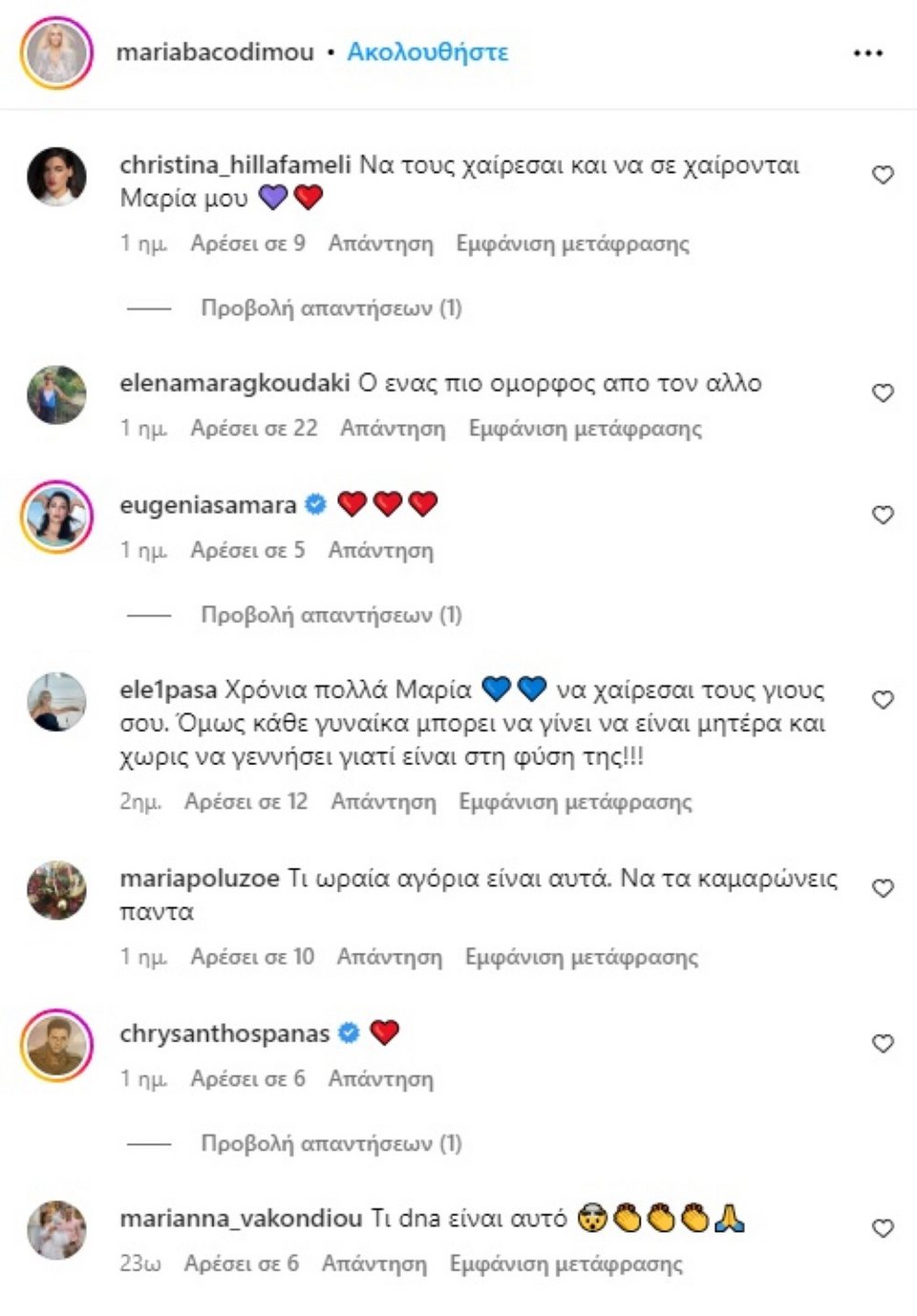 «Τους παντρεύετε;», αναρωτιέται διαδικτυακή φίλη της Μαρίας Μπακοδήμου, ενώ άλλοι ακόλουθοι της παρουσιάστριας τονίζουν ότι «ο ένας είναι πιο όμορφος από τον άλλον».