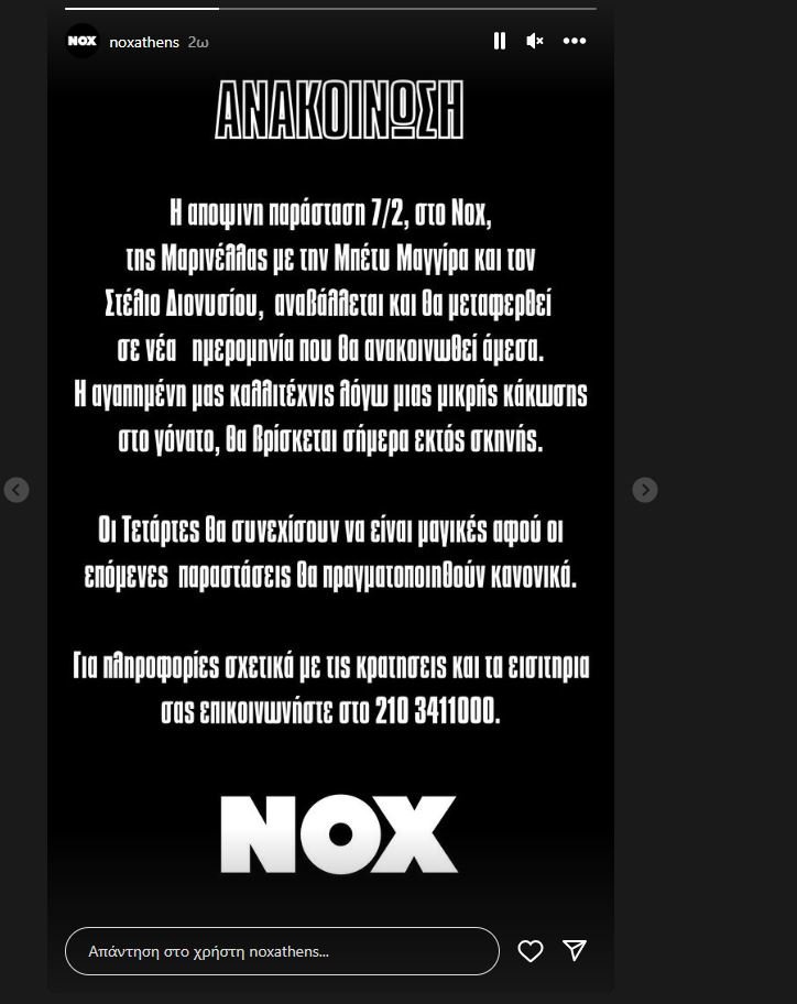 Όπως αναφέρει η ανακοίνωση του νυχτερινού κέντρου που εμφανίζεται η Μαρινέλλα: «Η αποψινή παράσταση 7/2 της Μαρινέλλας με την Μπέττυ Μαγγίρα και τον Στέλιο Διονυσίου αναβάλλεται και θα μεταφερθεί σε νέα ημερομηνία που θα ανακοινωθεί άμεσα. Η αγαπημένη μας καλλιτέχνις, λόγω μιας μικρής κάκωσης στο γόνατο, θα βρίσκεται σήμερα εκτός σκηνής».