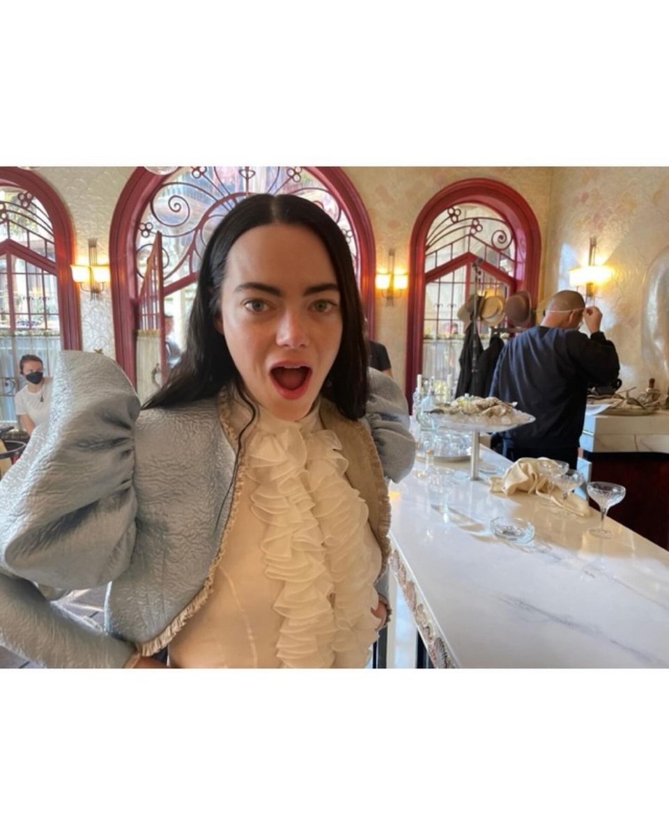 Στις τρεις φωτογραφίες που δημοσίευσε βλέπουμε τόσο τον ίδιο όσο και την συμπρωταγωνίστριά του Έμμα Στόουν να κάνουν αστείες γκριμάτσες φορώντας τα υπέροχα κοστούμια της ταινίας. Στην τελευταία βλέπουμε την εξουθενωμένη «Μπέλα Μπάξτερ» να έχει ξαπλώσει σε ένα μπαρ, με τα χέρια να καλύπτουν το πρόσωπό της, ενώ φορά το εμβληματικό γαλάζιο σύνολό της με τα φουσκωτά μανίκια και το βικτωριανό γιακά.