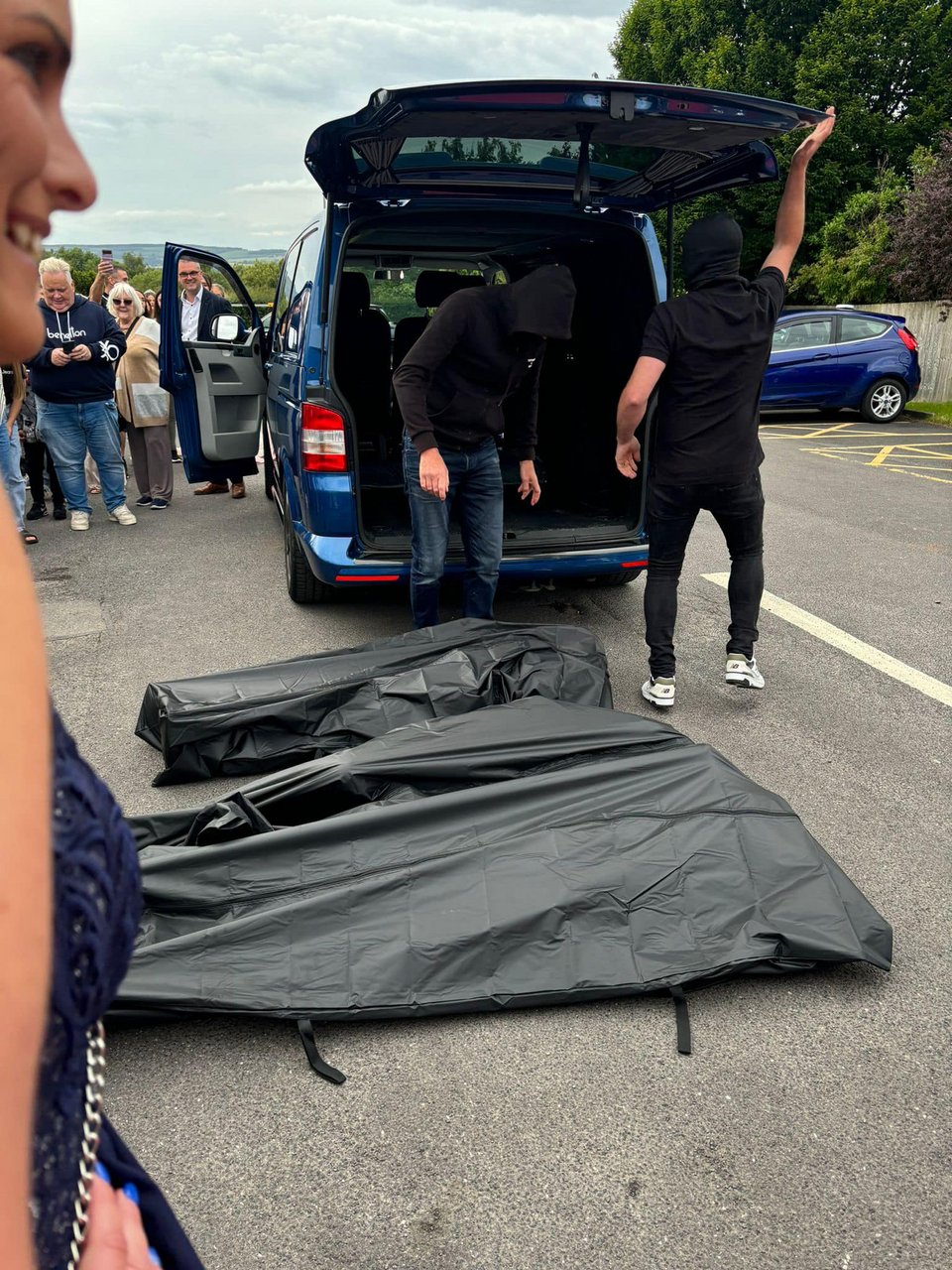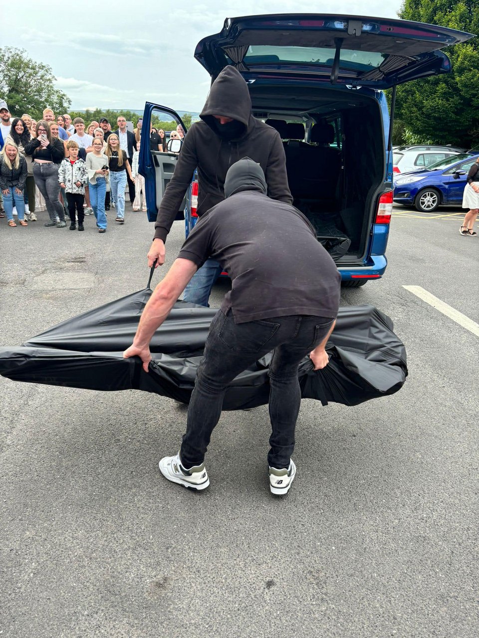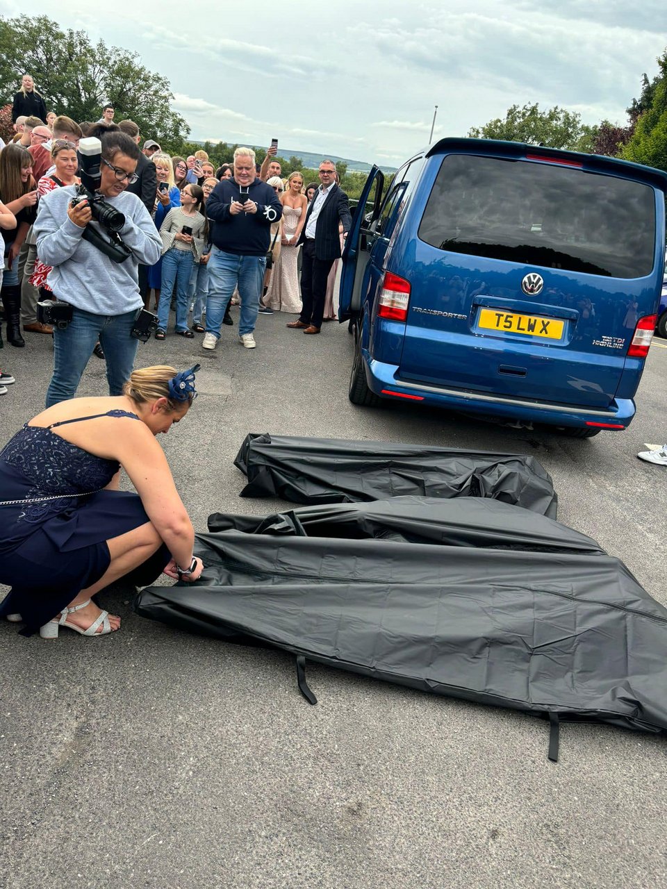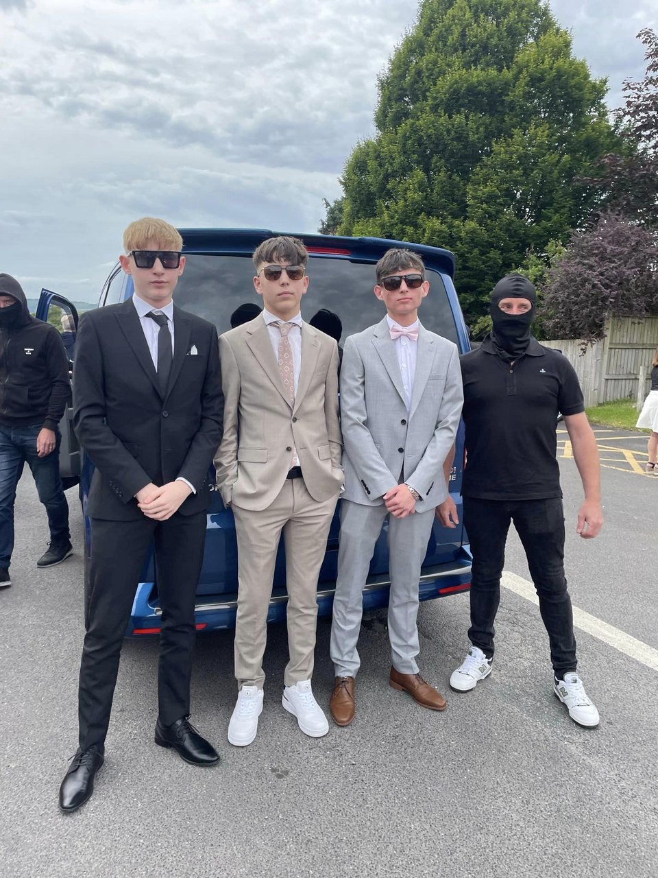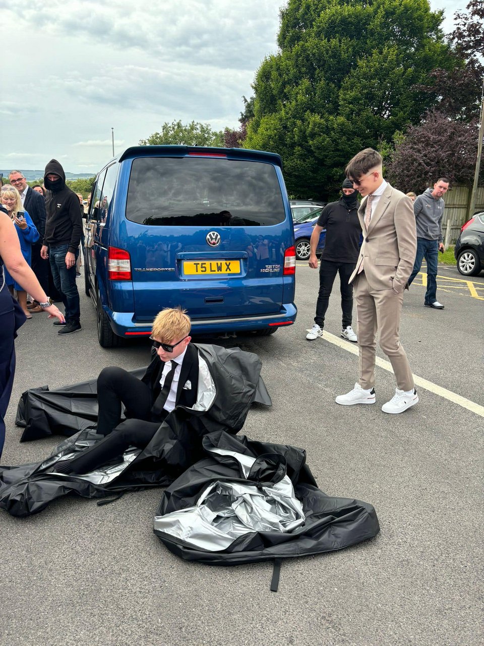 Ο 16χρονος Λούκας Τζέιμσον από το Oswaldtwistle στο Λανκασάιρ, έκανε μια εντυπωσιακή είσοδο στον χορό του σχολείου ντυμένος με κοστούμι 600 λιρών και κλεισμένος σε μια μαύρη τσάντα... πτωμάτων, μαζί με δύο από τους φίλους του.
