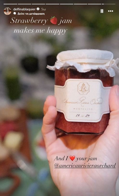 Η φωτογραφία στο Instagram Stories της Ρόμπινς έδειχνε την μαρμελάδα στο χέρι της με την λεζάντα: «@AmericanRivieraOrchard Το πρωινό, το μεσημεριανό και το δείπνο μόλις έγιναν λίγο πιο γλυκά».