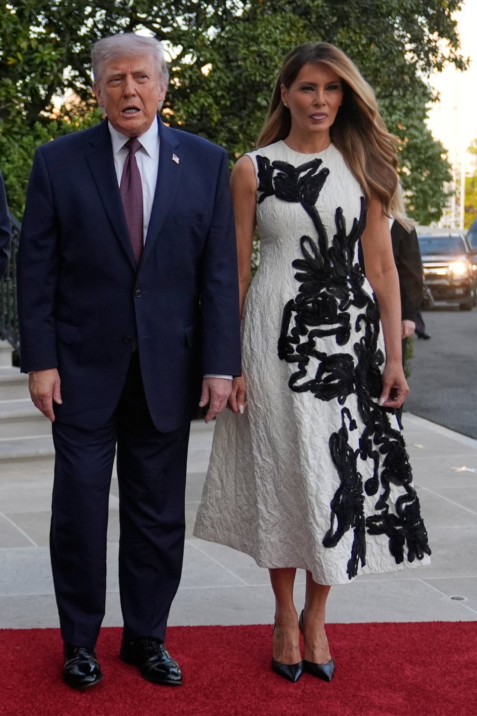 Η Μελάνια Τραμπ ξεχώριζε αποπνέοντας εκλεπτυσμένη κομψότητα καθώς υποδεχόταν τη βασίλισσα Μαξίμα. Για την περίσταση επέλεξε ένα εντυπωσιακό λευκό φόρεμα Erdem, διακοσμημένο με έντονες μαύρες φλοράλ απλικέ λεπτομέρειες.