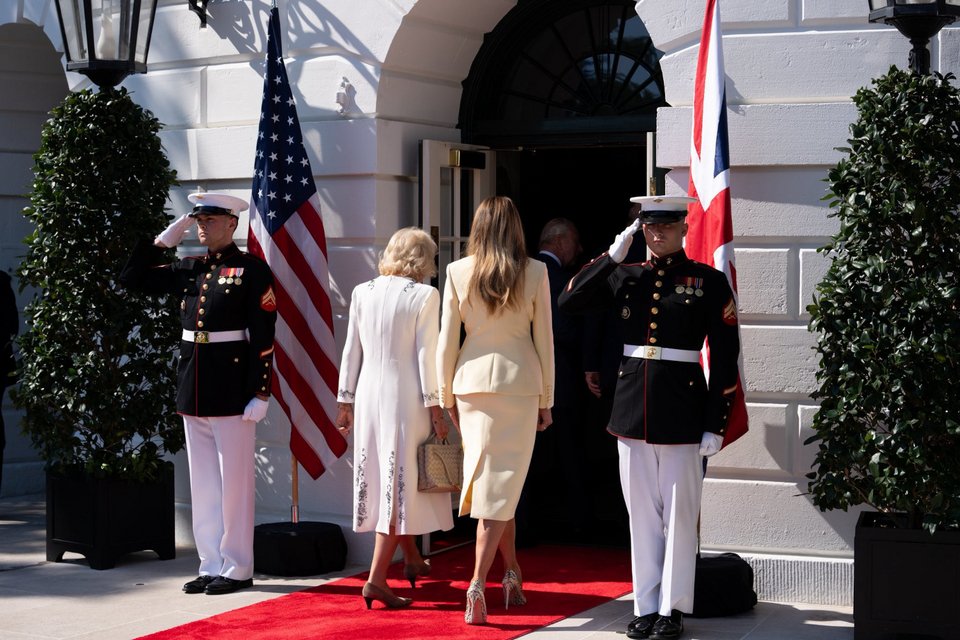 Στη συνέχεια, το βασιλικό ζεύγος συναντήθηκε στον Λευκό Οίκο με τους Τραμπ, με τη βασίλισσα Καμίλα να αλλάζει ντύσιμο, επιλέγοντας ένα λευκό φόρεμα από σιφόν με μαύρες κεντημένες λεπτομέρειες της Anna Valentine, η οποία είχε δημιουργήσει και το νυφικό της το 2005, ενώ διατήρησε την καρφίτσα.