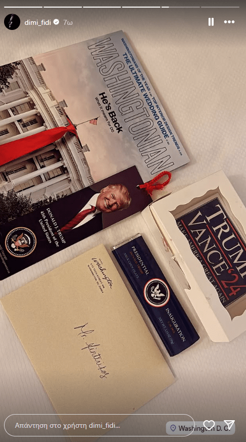 Αν και δεν είναι γνωστό αν η 20χρονη κόρη της Δέσποινας Βανδή και ο 37χρονος επιχειρηματίας ταξίδεψαν για να παρακολουθήσουν από κοντά την ορκωμοσία του Ντόναλντ Τραμπ, ο Δημήτρης Φιντιρίκος μοιράστηκε μερικές φωτογραφίες στα InstaStory του με «αναμνηστικά» του νέου Προέδρου των ΗΠΑ, όπως ένα περιοδικό, έναν σελιδοδείκτη, μια σοκολάτα και ένα κουτί αλλά και μια πρόσκληση με το όνομά του.