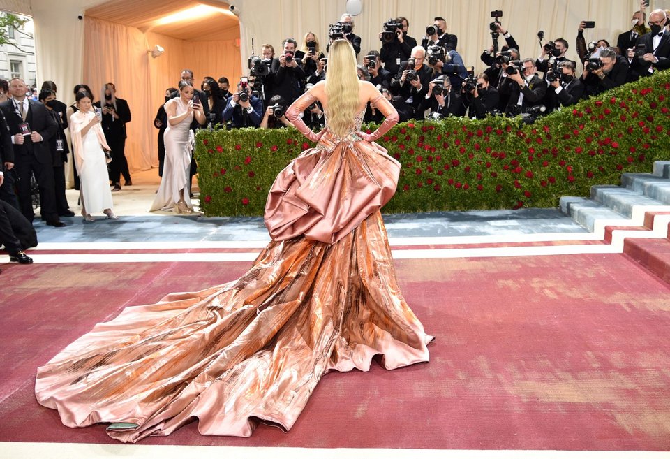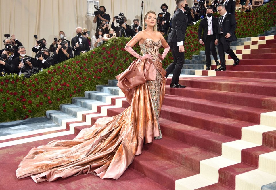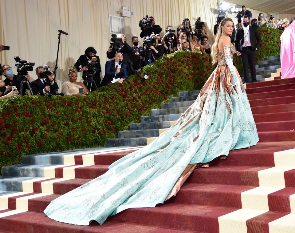 Η Blake Lively φορούσε ένα φόρεμα Atelier Versace σε ροζ-χρυσό χρώμα με έναν γιγαντιαίο φιόγκο στη μέση, τον οποίο φιόγκο, καθώς ανέβαινε τα σκαλιά, οι βοηθοί της ξεδίπλωσαν στο κόκκινο χαλί, μεταμορφώνοντας το φόρεμα από ροζ σε aqua blue μπροστά στα μάτια όσων βρίσκονταν συγκεντρωμένοι στο σημείο.
