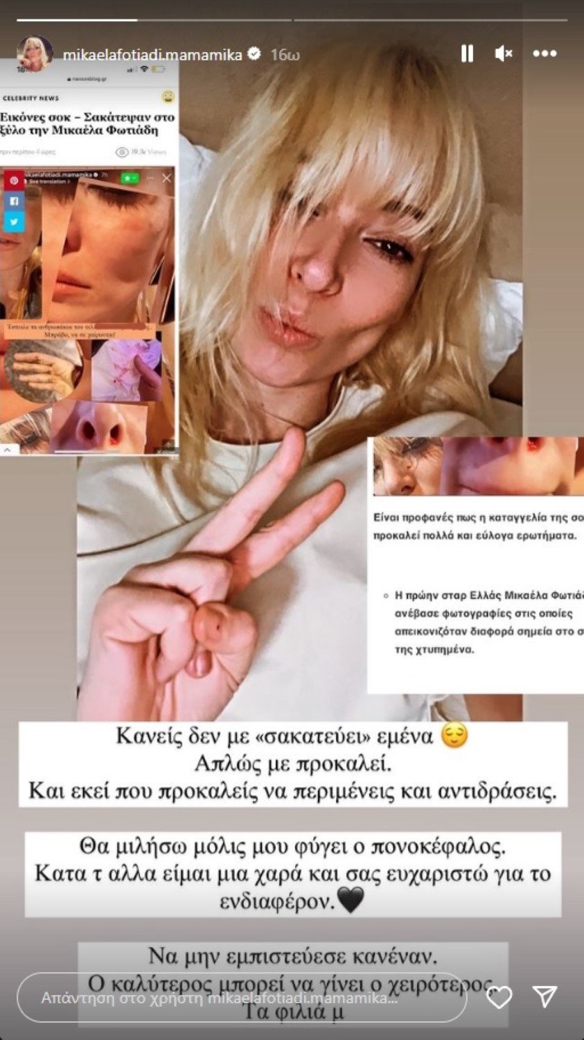 Σοκ προκαλούν οι φωτογραφίες που δημοσίευσε το γνωστό μοντέλο Μικαέλα Φωτιάδη στον προσωπικό της λογαριασμό στο Instagram, με την ίδια να καταγράφεται με μώλωπες και αίματα στο πρόσωπο.