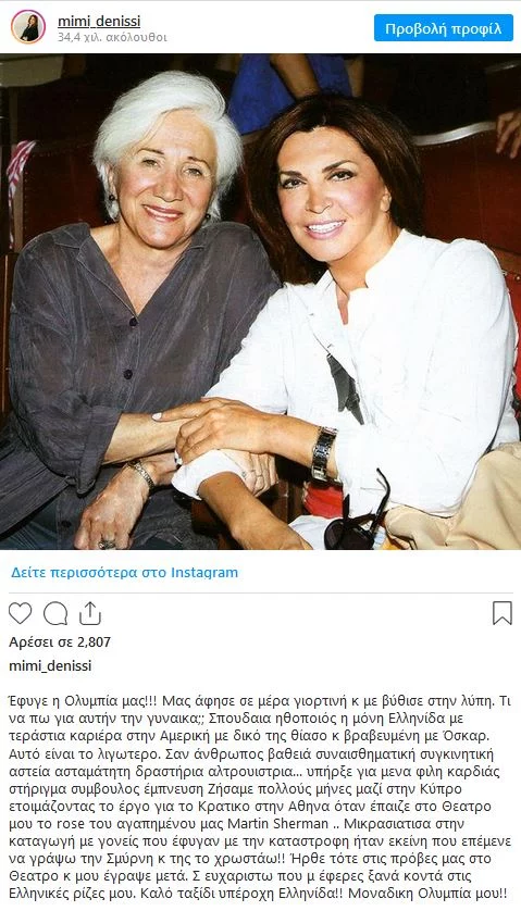 Με μια τρυφερή ανάρτηση στο Instagram της, η Μιμή Ντενίση αποχαιρετά την Ολυμπία Δουκάκη.