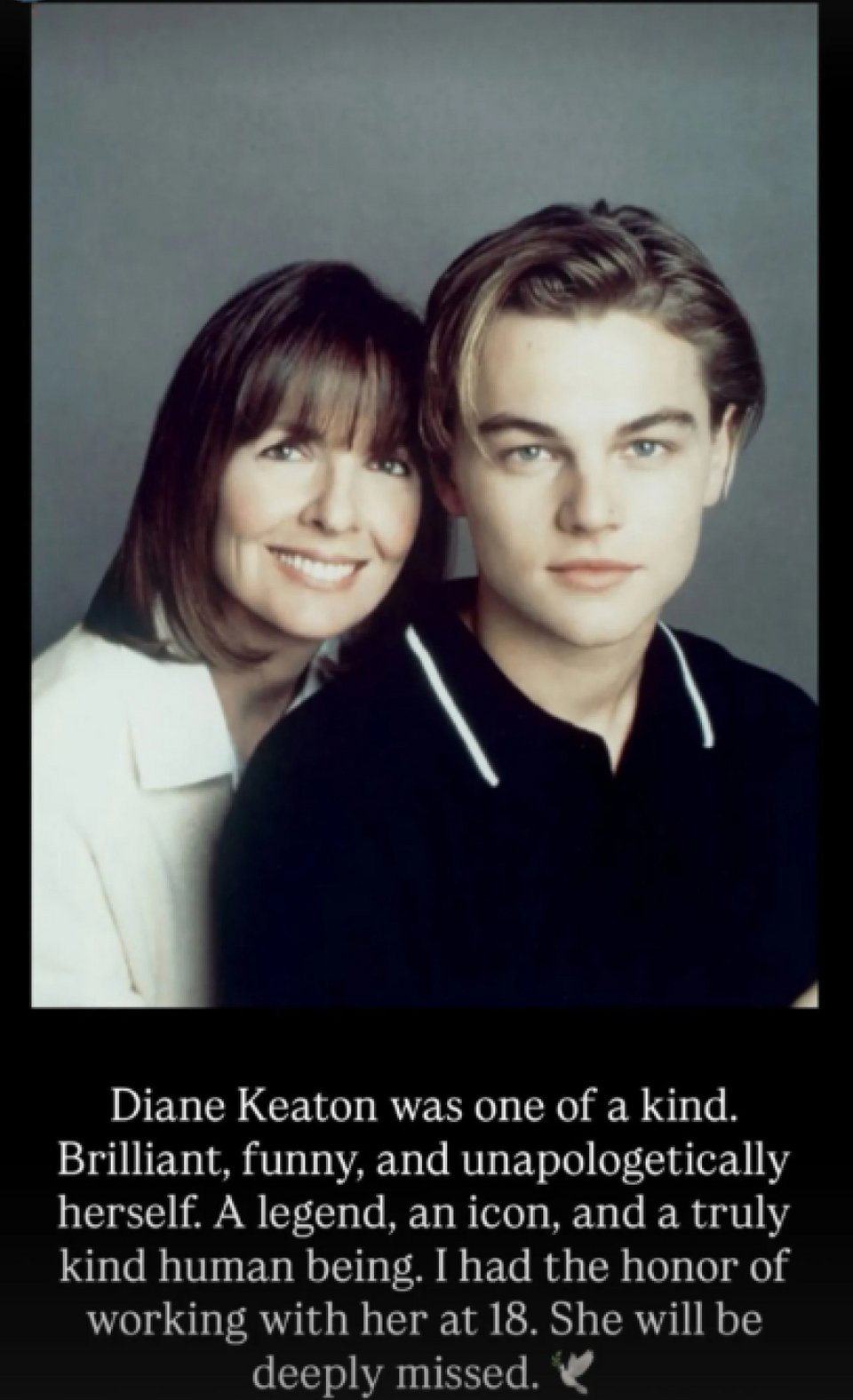 Σε ανάρτησή του στον προσωπικό του λογαριασμό στο Instagram, ο Ντι Κάπριο μοιράστηκε μια παλιά φωτογραφία από την εποχή των γυρισμάτων και έγραψε: «Η Νταϊάν Κίτον ήταν μοναδική. Λαμπρή, αστεία και αφοπλιστικά ο εαυτός της. Ένας θρύλος, ένα είδωλο και ένας πραγματικά ευγενικός άνθρωπος. Είχα την τιμή να συνεργαστώ μαζί της στα 18 μου. Θα μας λείψει βαθιά».