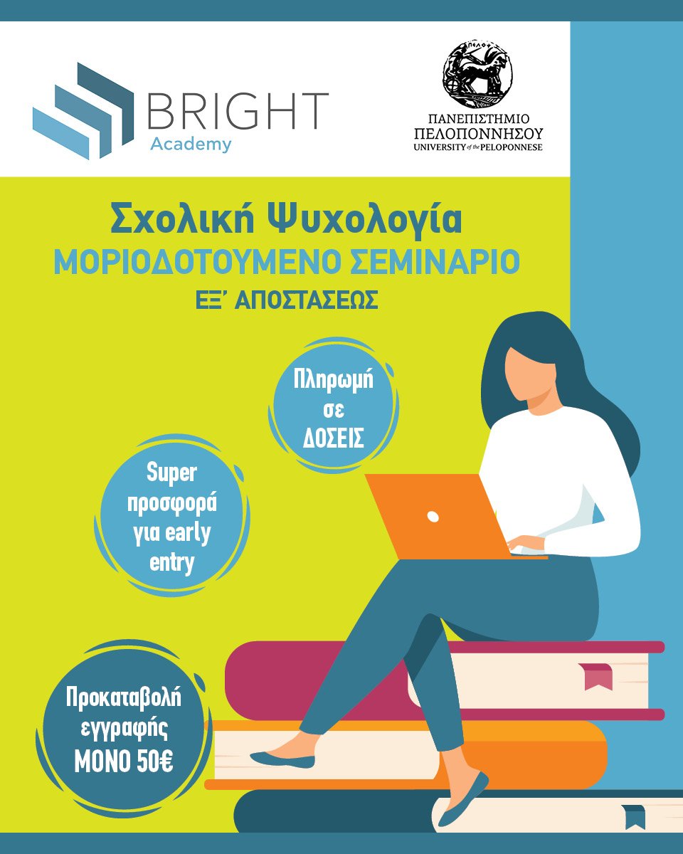 Με την υπογραφή της Bright Academy και σε συνεργασία με το Πανεπιστήμιο Πελοποννήσου το προσεχές διάστημα θα υλοποιηθούν μοριοδοτούμενα σεμινάρια στη σχολική ψυχολογία.