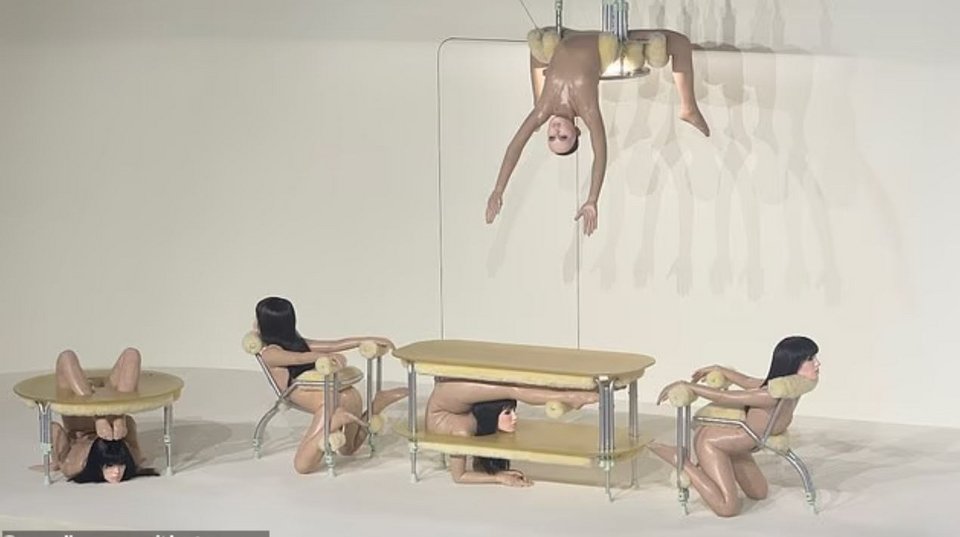 Πάνω από το σκηνικό κρεμόταν ένα «ανθρώπινο φωτιστικό», ενώ δίπλα βρισκόταν ένα τραπεζάκι σαλονιού φτιαγμένο από ακόμη μία κούκλα.